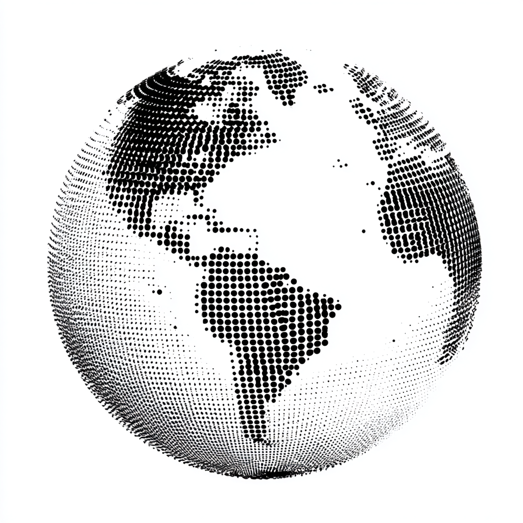 创建一个现代的,圆滑的,圆点风格的地球仪,在一个平坦的正面视图中显示大陆,南美洲突出显示。使用大的,均匀间隔的点来创建一个干净,极简主义,科技灵感的形状。设计应该唤起创新、全球连接和技术。避免渐变、阴影或复杂的效果;只使用纯色和易于在矢量中可视化的线条。确保地球仪是可扩展的,适合单色应用,使其完美地用于高科技公司的标志。