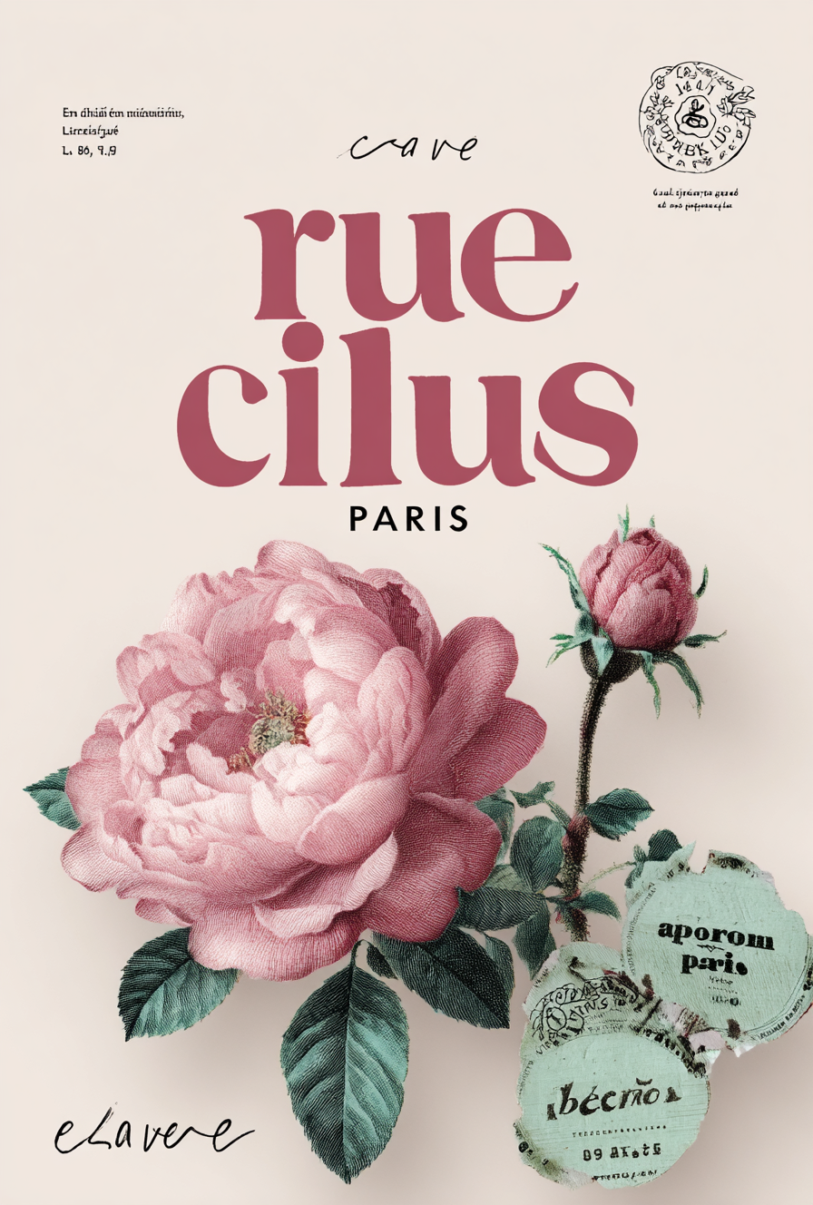 海报上写着“rue cieux paris”和粉红色的花朵,白色背景的平面设计,浅红色字母的文字堆叠在一起。风格是简约和现代。在图片的右下角有一个两片叶子的插图,上面写着“lografía ampromo”。它有大字写着“巴黎的爱”,下面的小字是一张库存照片和徽章或标志的日期。矢量插图。