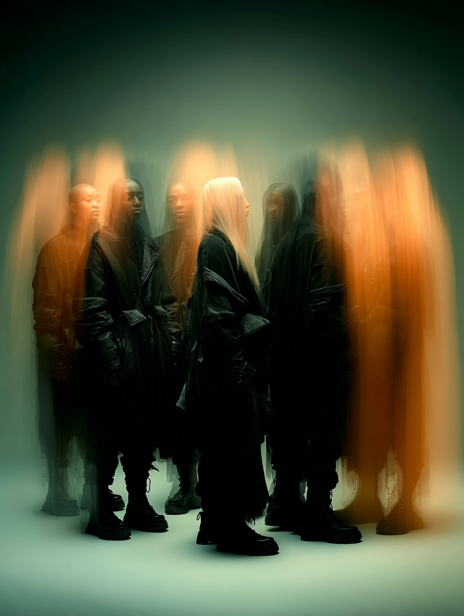一张超现实主义的时尚照片,一个神秘的女人穿着高级时装剪影从充满活力的青色雾中出现,用强烈的运动模糊和双重曝光效果捕捉。这个女人穿着许多街头运动服装,摆出了戏剧性的姿势。戏剧性和极简主义的构图与深黑色的背景,强调孤立和神秘。复古的粒状电影纹理,电影般的灯光,空灵的氛围唤起了一种挥之不去的运动和内省感。灵感来自实验模拟摄影和唤起,梦幻般的视觉效果。MJ绘画实现效果图。