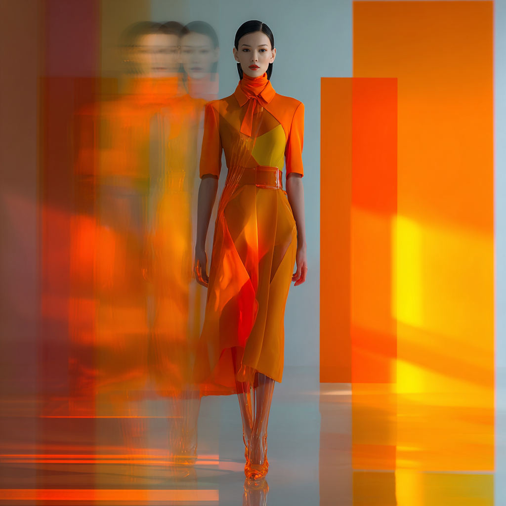 一个棕色长发的中性模特的高级时尚编辑摄影,向前走着。模特穿着由透明玻璃制成的雕塑高跟鞋。面部处理:脸部锐利、聚焦,面部无运动模糊,面部无双重曝光,面部瞬间定格,五官轮廓清晰,面部对称完美,肌肤质感自然逼真,高端美容编辑脸。运动:运动模糊只在身体、织物和腿部,微妙的长曝光轨迹围绕轮廓,模特身后流动的运动线条,织物和丙烯酸元素产生运动模糊,面部不受运动效果的影响。整件衣服都是单色的深橙色:一件有结构的高级定制连衣裙,用焦橙色调,半光泽的面料和建筑体量。身体和衣服部分覆盖着小的透明矩形丙烯酸类元素,可以折射光线。背景:平滑渐变的橙色背景,从软橘色到深琥珀色。灯光是电影式的和定向的,面部和边缘的美盘照明强调玻璃反射和织物纹理。相机:高端时尚编辑,中画幅外观,85mm镜头,f/2.8,浅景深。淡妆,干净的皮肤,中性的表情。超现实的实验时尚编辑,工作室拍摄,没有文字,没有标志。