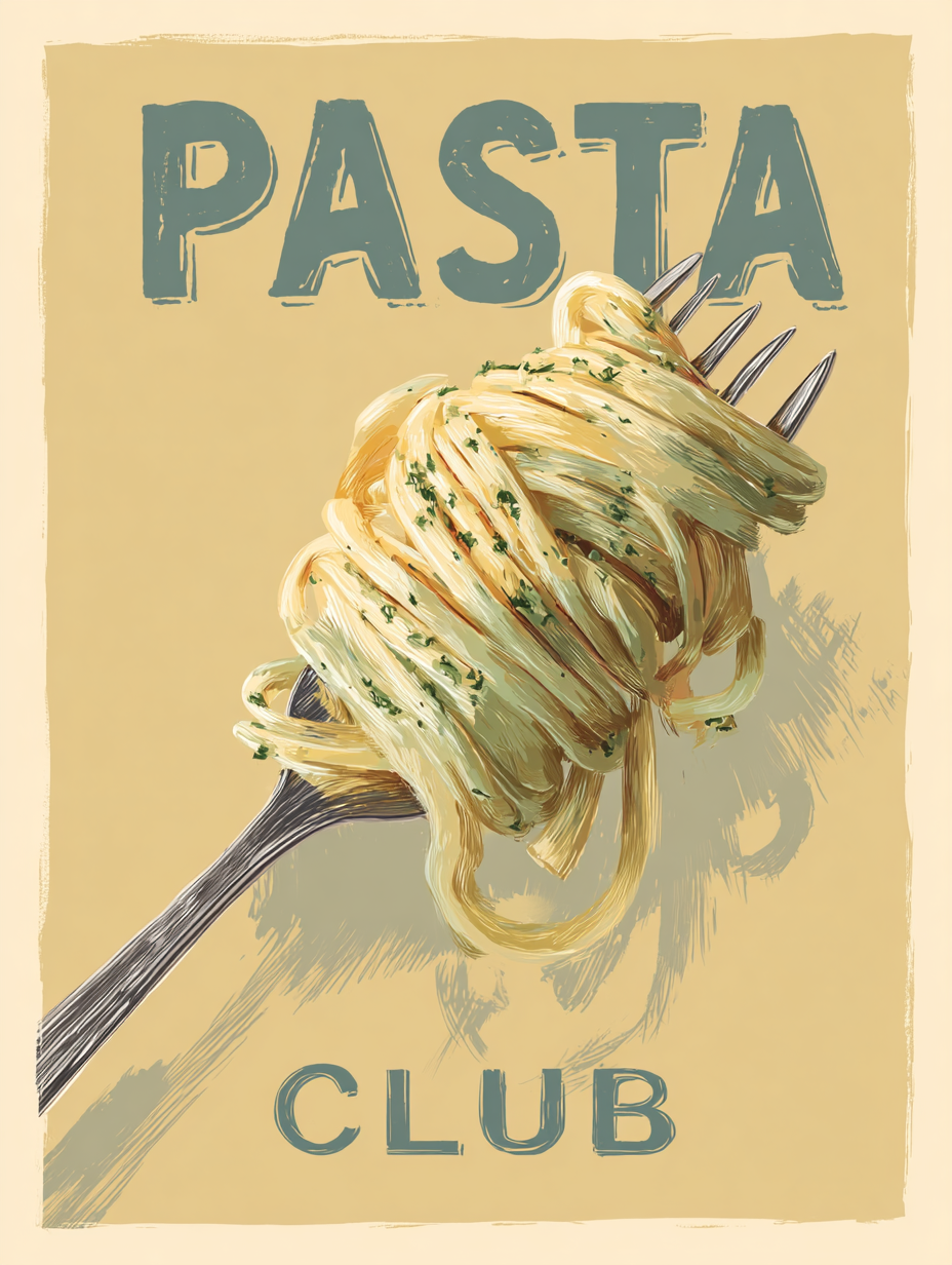 这是一幅手绘插画,画的是一束意大利面绕着叉子旋转,背景是温暖的米色。意大利面应该涂上柔和的灰白色和柔和的橄榄绿色调,有明显的笔触和略微不完美的手绘线条,就像画布上的丙烯酸或水粉。叉子应该简单而有风格,用柔和的绿色,而不是金属或闪亮。背景应该是温暖的奶油米色,带有微妙的帆布纹理和柔和的色调变化。在顶部,“PASTA”这个词应该以一种松散的、柔和的橄榄绿手绘笔刷字体出现。底部的“CLUB”字样同样是手绘风格,略显不完美而有机。整体的感觉应该是现代,斯堪的纳维亚和地中海,平静和优雅。避免矢量样式,避免平面插图,避免尖锐的边缘,避免数字或海报式的图形。艺术品必须清楚地看起来像一幅真正的油画在画布上,适合作为优质的墙壁艺术。