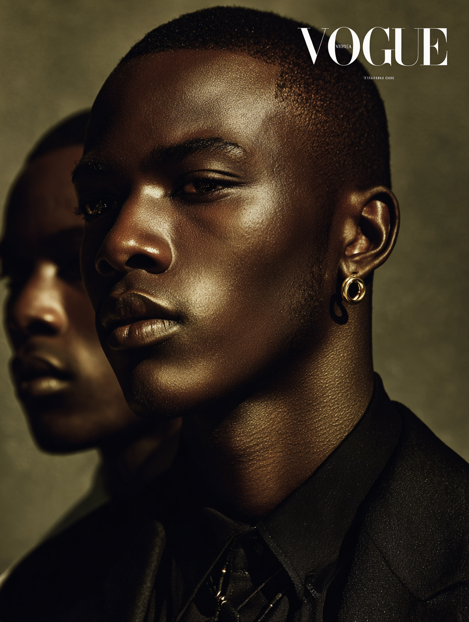 一个欧洲男人的耳朵和耳环的特写,他穿着黑色的衣服,皮肤哑光,带有古铜色的亮点。这张详细的照片展现了这个男人皮肤的完美状态。照片中央戴着时髦的金色椭圆形耳环的耳朵是主要焦点。为《时尚》杂志拍摄时尚编辑照。为网站拍摄。MJ绘画生成炫酷的人物图。