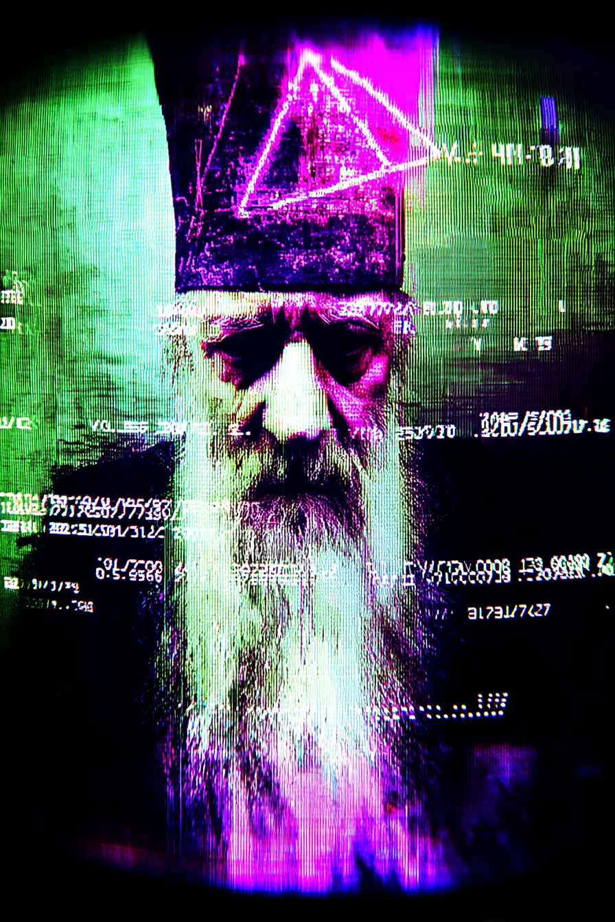 战锤,变化之王。这幅图像看起来像是20世纪70年代神秘恐怖b级片的剧照。胶片呈颗粒状,洗后有VHS退化效应,可见扫描线和色差。这张照片有一种令人不快的复古恐怖/幕后氛围,表明它可能被呈现为真实的。以古斯塔夫·多尔维尔的风格,以Zdzisław Beksiński的风格,用随机的小故障风格的文字“有机”。带有Unicode和宗教符号叠加的VHS失真屏幕。在诅咒的风格,故障,故障视频截图,复古汽波,网络朋克,温室,巫术,vhs失真屏幕,故障艺术,数据,数据库,3d视觉,宗教图像,双重曝光,叠加Unicode符号。宗教肖像,双重曝光,叠加Unicode和宗教符号。洛夫克拉夫特、神秘主义、撒旦崇拜、巫术、萨满教、宗教狂热、极权主义宣传艺术。ralph eugene meatyard, Minor White, Frank Vic和d<s:1> sseldorf摄影学院,tesseracts,神圣几何,多重曝光,叠加统一码和宗教符号,六边形,螺旋形,叠加统一码和宗教符号。