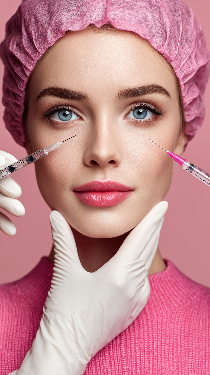 一个女人的脸部特写,她有着古铜色的皮肤,蓝色的眼睛和粉红色的自然嘴唇。一群身材娇小的利力浦特女人,让人想起身材娇小的人类医生,穿着白色的医疗服,积极地在她的脸上工作,用遍布她脸上的注射器给她注射恢复活力的药物。背景是柔和的粉红色,增加了异想天开和超现实的气氛。这个场景传达了一个有趣的想法,即小专业人员正在进行整容手术,重点是女性平静的表情。MJ中文版绘画提示词。