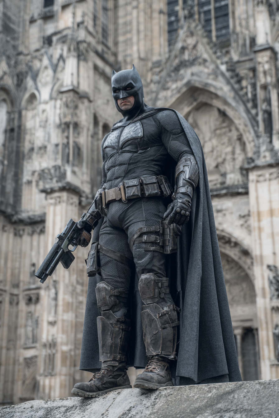 单色全身超逼真的图像,小队的最后领导人站在大教堂废墟上,黑色蝙蝠翅膀卷在后面,穿着战术神圣盔甲,在战争涂上发光的眼睛,高耸的12英寸靴子,拿着两支步枪在她面前,长面纱在风中飘动,电影照明,哈苏H6D清晰度,100mm f/2.2, ISO 100, f/1.8