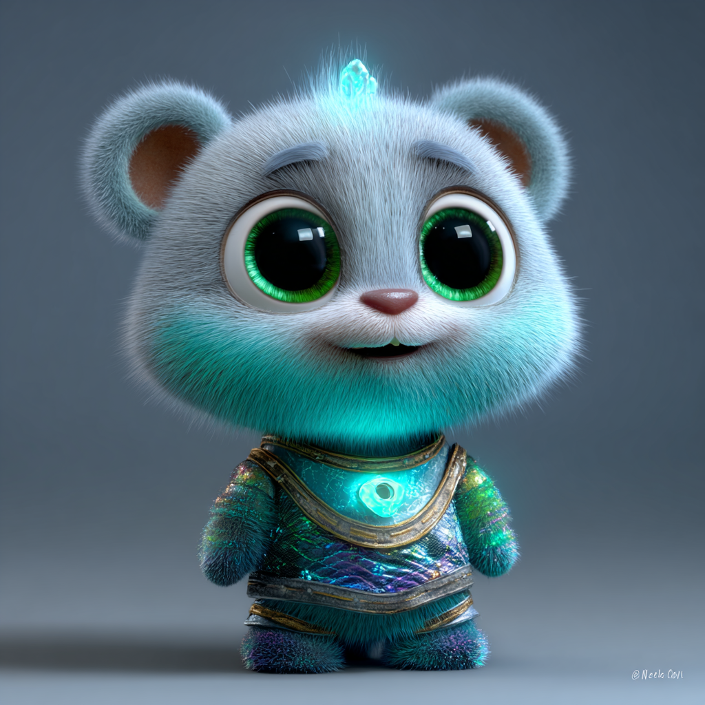 这是为学前电视连续剧《尼米和世界之间的花园》设计的一个非常详细的2D动画角色。皮克斯-梦工厂风格,明亮的海洋色彩,富有表现力的大眼睛,柔和的灯光,柔软的皮毛和皮肤纹理,可爱而聪明的外观,非常适合Netflix儿童节目,超细节,全身,前视图,玩具设计。Onii是一只可爱的小熊,有着光滑的银蓝色皮肤和明亮的绿松石色眼睛,带着善良和顽皮的微笑。他脖子上挂着一个发光的小水晶坠饰,穿着一件由光和气泡制成的波浪形盔甲。他的特殊能力是治愈海洋和打开神奇的水之门。他友好、勇敢、好奇,对他的朋友尼米非常忠诚。