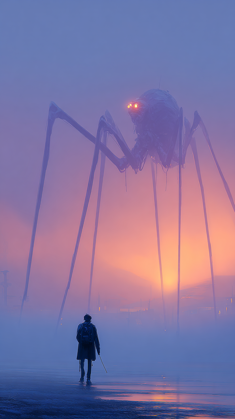 数字奇幻艺术,一个孤独的旅行者站在薄雾笼罩的黄昏,面对着一个巨大的昆虫般的生物,长着细长的腿,超现实的紫色和蓝色渐变天空,空灵的朦胧气氛,电影般的灯光,史诗般的神秘情绪,逼真的细节,ArtStation热门