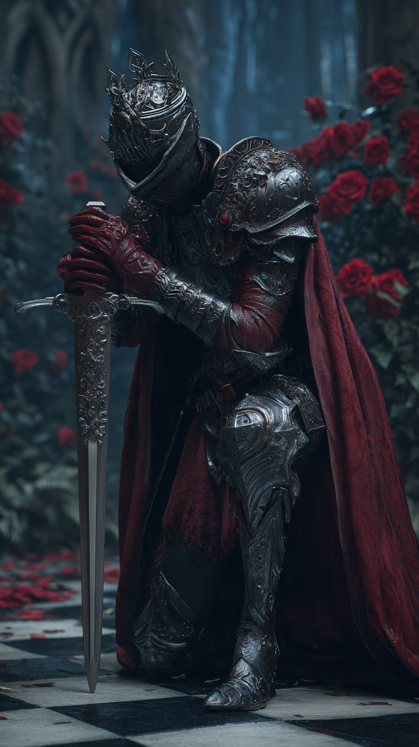 这是一个史诗般的全身摄影镜头和动态角度,一个高大的,幻想的男性骑士,他有一个覆盖着暗红色闪亮的骑士头盔,暗红色的全身盔甲,全覆盖的胸板和暗红色的战士金属腿板和暗红色的金属靴子。他拿着一把银色的长剑,双手戴着红色的手套。背景是每一个幻想爱丽丝在仙境的主题城堡,深红色的玫瑰,黑色和白色的象棋地板,阴雨的天气。蓝色调,暗阴影。
