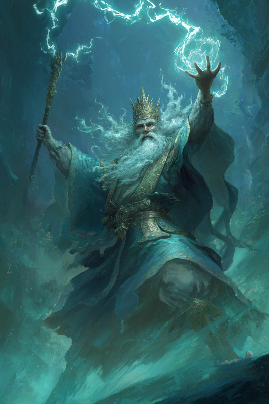 在史诗般的奇幻肖像中,一个强大的国王被重新想象成一个全身的大法师。他是一个人形人物,有着飘逸的白发和雄伟的胡须,散发着力量。他穿着皇家长袍,戴着精致的金冠。他以一个戏剧性的姿势站着,双臂高高举起,施着一个不朽的咒语,右手握着一根发光的魔法杖。权杖释放出魔法能量的漩涡带,有力地吞没并环绕着他的身体。**主色调是深蓝色和葱郁的绿色,与发光的蓝绿色和紫色的口音,创造一个神秘和空灵的气氛,灵感来自发光的森林生物的参考图像。艺术风格是一种富有表现力和粗犷的数字绘画,非常大胆,沉重的笔触和强有力的动态线条,给人一种原始力量和古老魔法的感觉。**他挥舞的魔法能量也与这些蓝色和绿色一起发光,作为主要光源,创造出强烈的魔法背光。这个场景是从低角度拍摄的,向上看,以强调他压倒一切的力量。背景是抽象的,由充满活力的神奇能量和深沉的大气色调组成。专注于他的威严的存在,原始的魔法力量,和令人敬畏的奇观在一个神秘的,超凡脱俗的设置咒语。