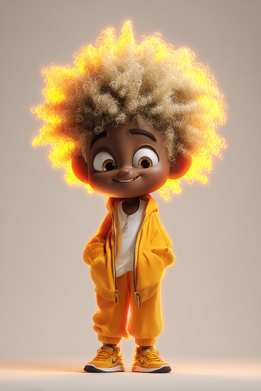 皮克斯风格的3D吉祥物,一个快乐的黑人男孩代表太阳能,大头小身体(迷你比例)。全身,白色背景。肤色:深棕色中带暖金色,柔和光线下自然光泽。头发是卷曲的,淡金色的,有亮黄色的亮点,蓬松而有光泽,反射光线,就像接触到阳光一样,头发应该感觉明亮和辐射,象征着太阳能。明亮富有表现力的眼睛,自信友好的微笑,愉悦的姿态。穿着黄色、橙色和白色的现代运动装,比如彩色夹克衫、t恤和慢跑裤。衣服必须看起来真实且可生产,由棉布、尼龙和聚酯等面料制成,没有图案,只有纯色面板。黄色运动鞋,柔和的工作室灯光,逼真的材料渲染,电影皮克斯风格的细节,与Ventania和Gota吉祥物一致的设计。