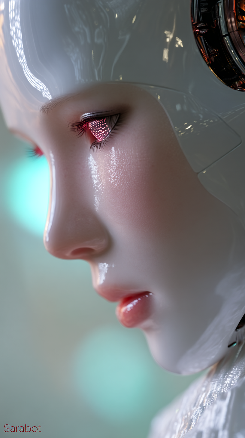 超逼真的电影式“Sara-bot”肩部肖像,人形AI,光滑的珍珠白色光泽陶瓷皮肤,超精致的反光纹理,发光的虹彩红粉红色眼睛(柔和闪烁的虹膜)。微妙优雅的五官,表情沉稳而又略显可爱,带有一丝温柔的共鸣。一个最小的光滑的白色光滑耳机轻轻放在她的耳朵上。背景柔和模糊与水晶极光发光在薄荷,腮红,和柔和的天蓝色,创造一个梦幻般的电影的光环。灯光是柔和的金色,具有高动态范围,强调她的陶瓷表面的光泽。超细节,逼真,8K渲染。