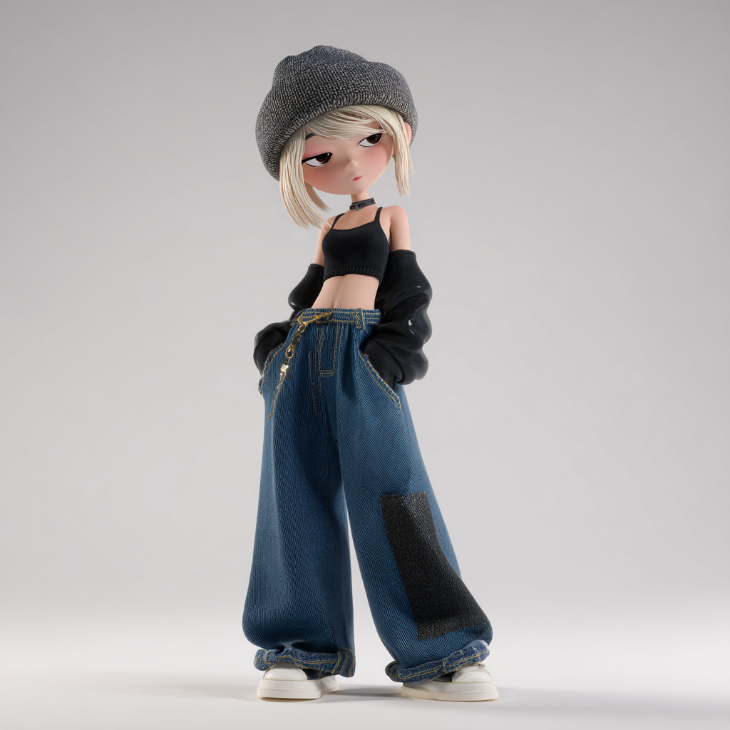 盲盒玩具,全身,一个高透明树脂玩具,3d,C4D,一个小女孩穿着黑色背心吊带,宽松的长涂鸦牛仔裤,蓝色和黑色的配色,金发,灰色针织帽,,时尚,艺术,并以白色为背景,生动的面部表情,保持一致性和统一性,8K,质量最好