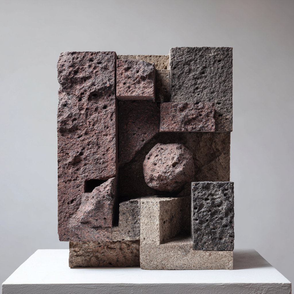 在北欧极简风格的桌面上,立着一件立体的石头艺术品,描绘了一位现代网球运动员拿着球拍打网球的经典动作。该作品由许多形状和大小各异的不规则粗糙玄武岩块组成。整个作品极其简洁,但同时又极具抽象艺术性和动态性。岩石连接的接缝非常明显,玄武岩的粗糙纹理和粒度清晰可见。