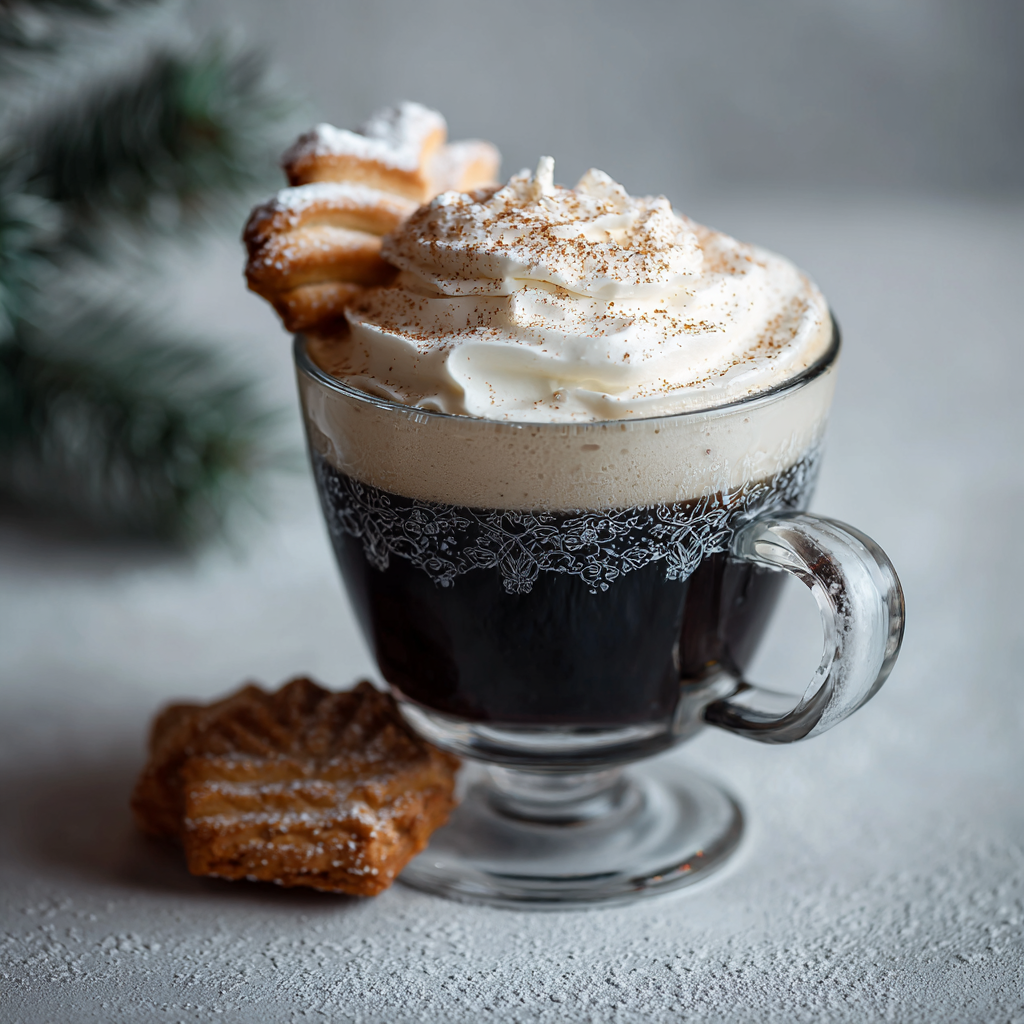 一个小的,优雅的,极简主义的玻璃杯(没有把手),深色的,浓郁的拿铁咖啡,直接从前面看。这款杯子有精致的糖粉边缘,增添了节日的冬日气息。上面撒上一大圈生奶油,轻轻撒上肉桂粉。两块传统的新月形香草饼干(Vanillekipferl),颜色苍白,撒上糖粉,精致地放在鲜奶油上面。专业工作室食品摄影,纯米色背景,浅景深,柔和阴影,高细节,逼真纹理,舒适冬季美学,风格摄影,相机前视图
