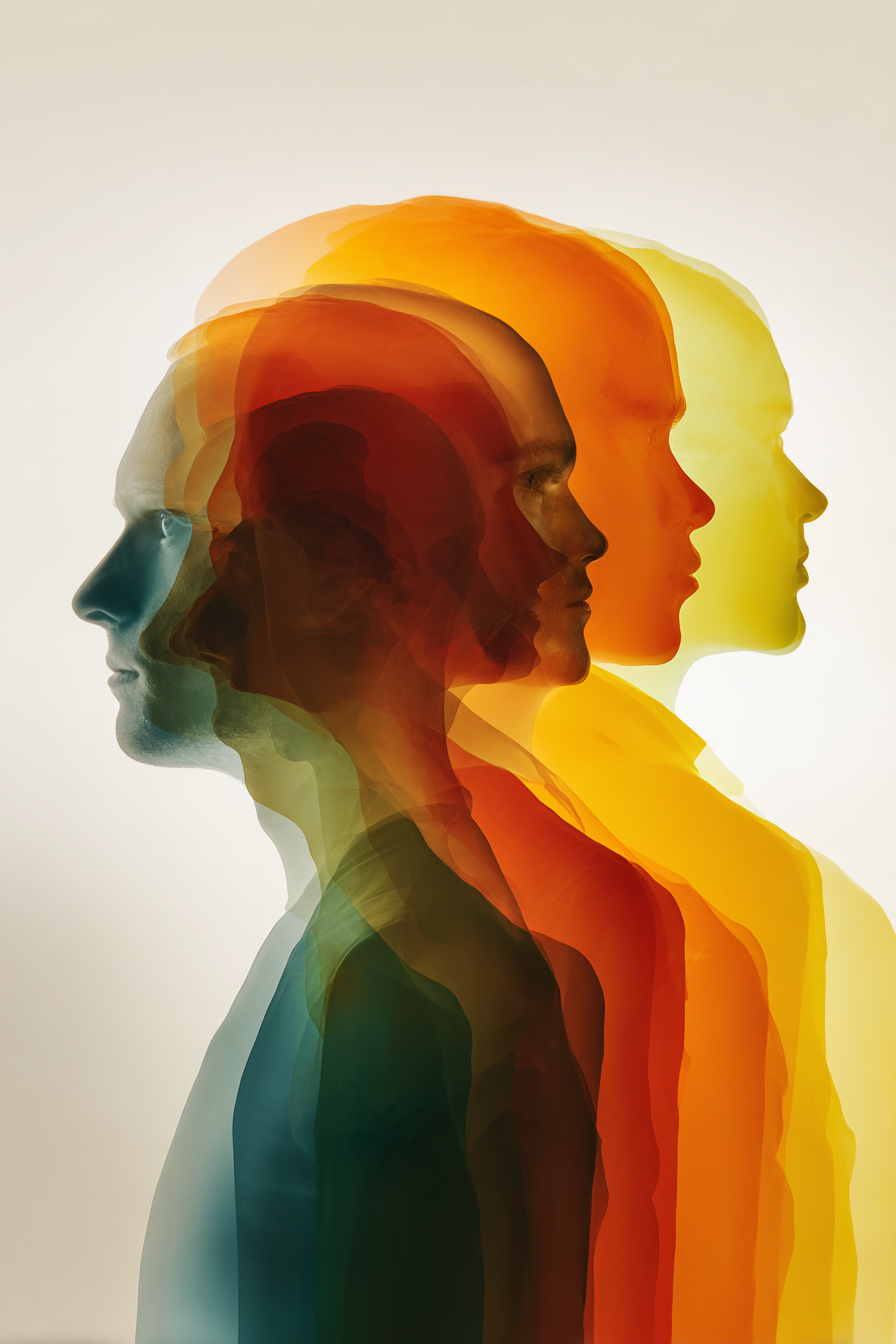 DiSC行为模型的极简海报设计,侧影视图中四个人头剪影相互重叠,每一个都采用不同的半透明颜色(红、黄、绿、蓝),柔和的渐变照明,抽象的心理学主题,干净的白色背景,优雅的排版,现代美学,微妙的阴影,专业的构图