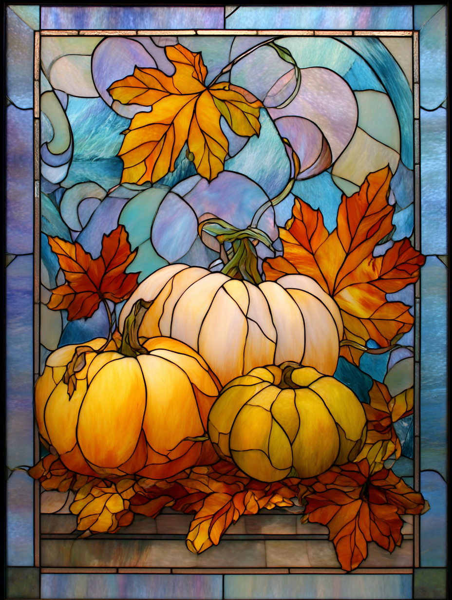 这幅方形彩色玻璃画,宽26英寸,宽52英寸,描绘了三个南瓜和枫叶的场景。三个大小不一的南瓜,从淡黄色到橙色,再到浅色,随意地排列在画中。南瓜的周围是造型优美的枫叶,有的完好无损,有的漂浮在空中,有的落在南瓜上,有的躺在地上。叶子堆在南瓜周围。这幅画以秋天的色彩为主,使画面充满了浓郁的秋天气息。玻璃由充满活力的半透明颜色制成,包括柔白、彩虹白、仙女绿、金黄色、蒂芙尼蓝和水绿色,每一部分都用粗体黑色勾勒出来。背景以优美的曲线和柔和的色调为特色,带有清晰、温暖的色彩梯度,唤起了透过玻璃过滤的阳光的形象。艺术品装饰有一个优雅的彩色框架,让人想起经典的蒂芙尼彩色玻璃窗。