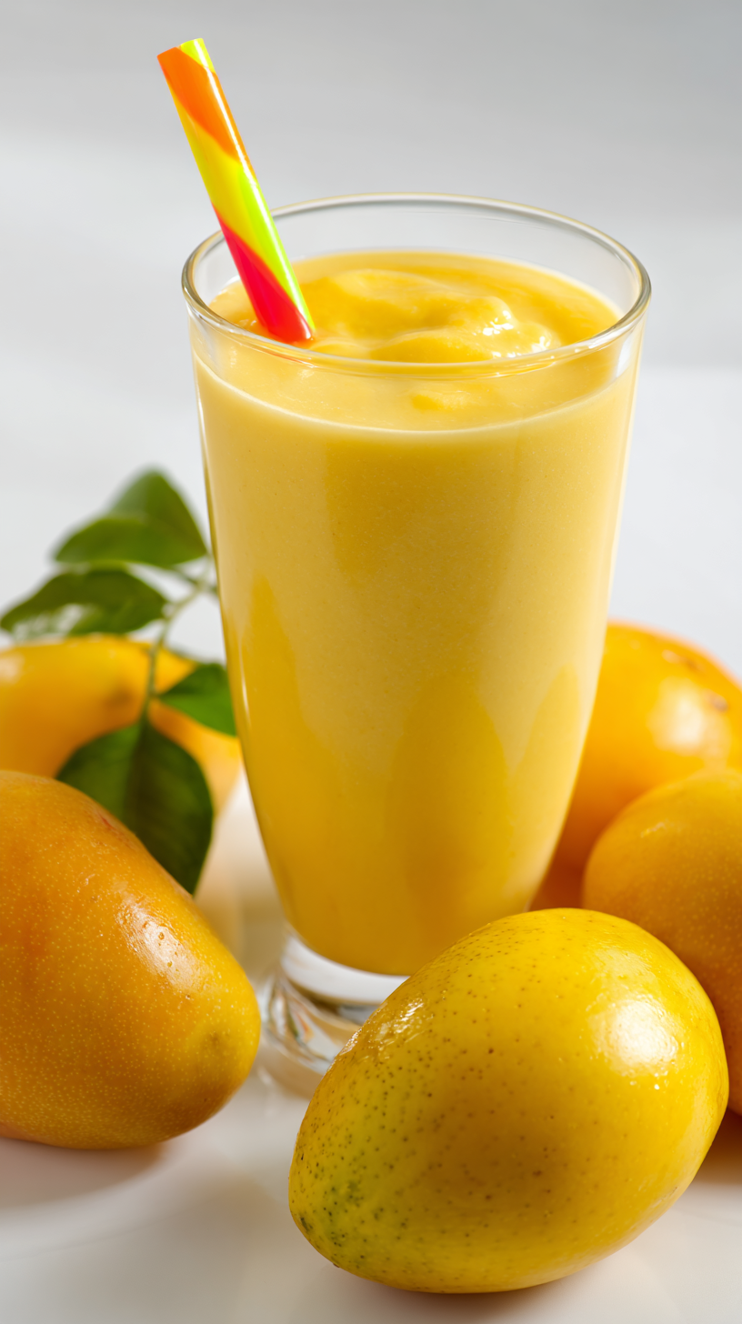 这是一个商业风格的场景,展示了一杯浓芒果奶昔,中间有一根彩色条纹吸管。在杯子周围,有新鲜的热带水果,成熟的芒果和哥伦比亚黄色百香果(maracuy<s:1>),表皮呈亮黄色。这款冰沙看起来很浓稠,像奶油一样,充满活力,自然光反射突出了它的质地。背景是干净的白色纯色,给人一种明亮,极简主义和专业的广告外观。整体气氛清新,热带,令人开胃。