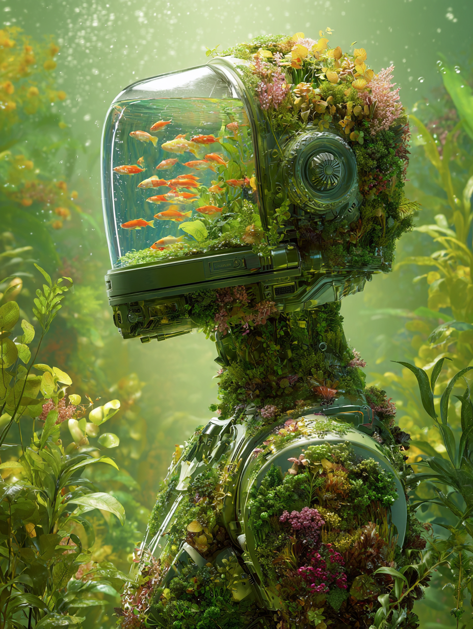 一个由植物制成的机器人,头上有一个水族馆。玻璃里面装满了五颜六色的鱼和植物。这个机器人有着绿色的皮肤,上面长满了水生植物。画面非常细致,具有超现实、超细节、超写实的风格。背景是充满植物的绿色与水的光泽。梯度背景