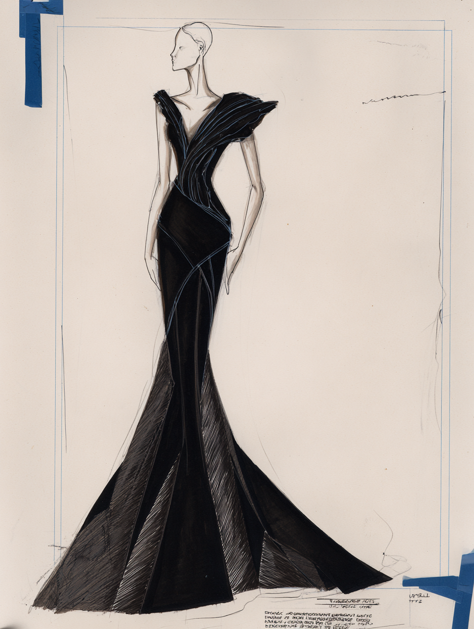 一幅手绘的白色晚礼服草图,复杂的层次增加了设计的深度。这条裙子的特点是蓬松的袖子,展示了戏剧性的体积,而紧身胸衣则装饰着深色的祖母绿。布景设计师的笔记详细说明了裙摆上的薄纱等材料,创造了一种身临其境的体验。