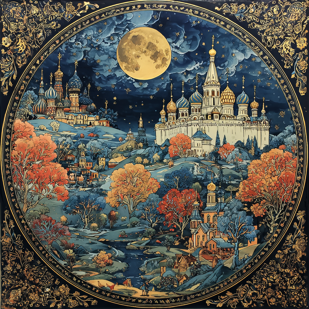 画为纺织,雄伟的月亮和天空,精美的细节绘制在风格化的风格,一个神奇的优雅的细节星星,深颜色,艺术家伊万·比利宾景观。一幅奢华的手绘插图,在中心展现了一种庄严的风格:极简主义的优雅与Bilibin童话般的线条艺术相结合,就像为沙皇俄罗斯重新构想的hermires盘子