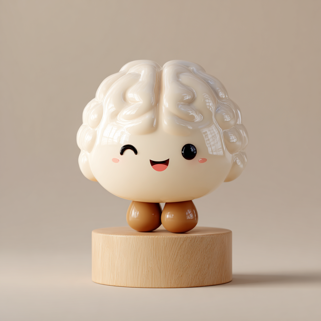 可爱的吉祥物一个人脑,光滑圆润的脑褶皱,奶白色的色调,卡哇伊最小的脸,眼睛小而闪亮,小圆鼻子和微笑之间,干净的白色背景,大脑坐在一个简单的短光滑的圆柱体基座(不是蘑菇,不是茎),比例chii风格,柔和的阴影,柔和的照明,中性,没有蘑菇纹理,没有植物元素,没有花椰菜的样子,干净简单,premium美学