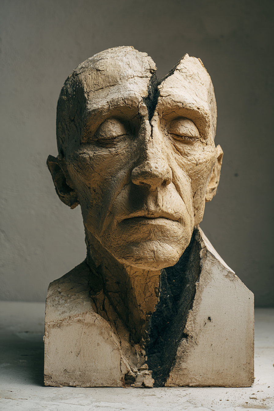 一个超现实的破产,复合材料的结合,没有手,严肃的人的特性的组合的半身像平静的脸,闭上眼睛,粗糙和富有表现力的石膏纹理,垂直地在他的光头伸出的两个角,一个盒子般的身体,胸前有一个奇怪的纹理和形式已经不对称,有机颜色,黑色垂直下降从脸到身体的底部,泥土和哑光的颜色,原始的手工制作的质地,工作室照明,简单的极简背景