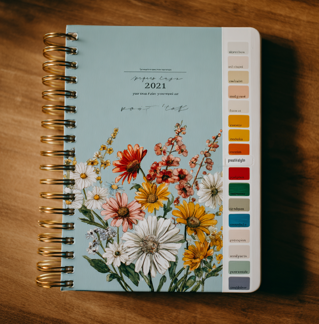 这是一本浅蓝色的螺旋笔记本,封面上是春天的花朵,上面写着“2024年让我们去印刷”,中间是雏菊的插图,颜色有红色、粉红色、白色、绿色、黄色、橙色、粉红色、紫色、白色和绿色,还有浅米色、灰白色、深天蓝、淡珊瑚色和暖琥珀色。标题是“lauren jstoryboard纸质日记”,右上方有一个名字标签,上面写着“p(ptrmath rei)”。它有一个开放的页面在前面写作或绘画,并设置在一个普通的背景。