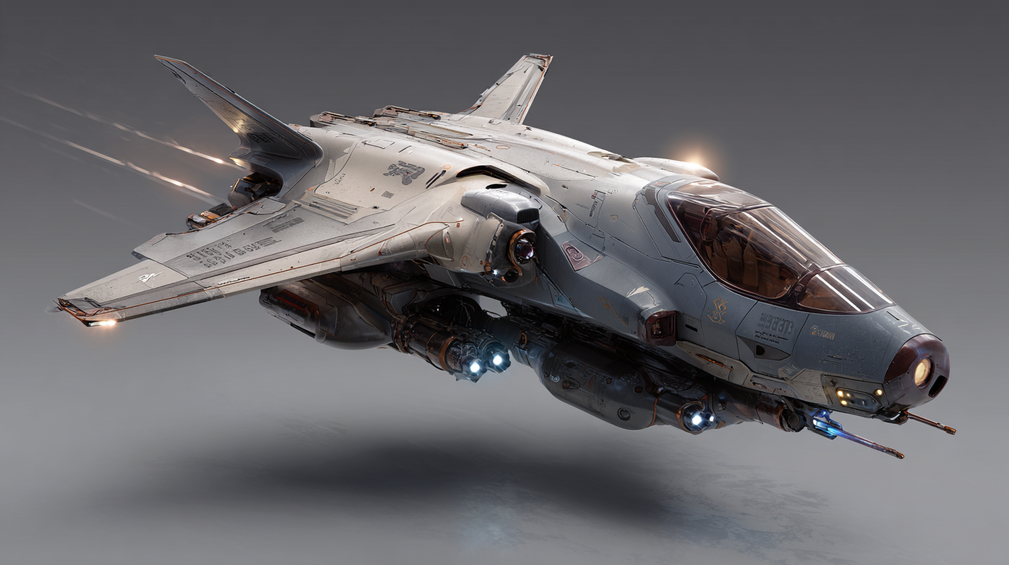 科幻攻击飞船的灵感来自于游隼,潜水姿势。硬表面建模。机翼的特点是铰接的机械羽毛作为气动襟翼和散热器。可变几何机翼结构。材料为拉丝各向异性航空铝和深色陶瓷复合装甲。机翼边缘有烧焦痕迹。复杂的机械连接连接羽毛。激进的军事美学,发光的引擎通风口,体积雾,光线追踪反射,高保真的虚幻引擎5可视化,锐利的焦点
