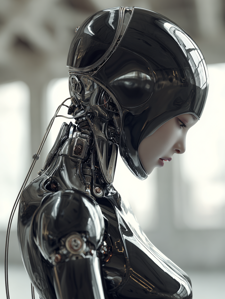 半身像的女性半机械人盯着相机,全金属包括脸,没有皮肤,没有肉的色调,反光镀铬表面,优雅和圆滑的比例,详细的机器人关节,柔和的工作室灯光,Hajime Sorayama风格,相机稍微向后拉,中心构图,主体周围的充足空间,3/4的人物框架,锐利的焦点,高度抛光的金属纹理