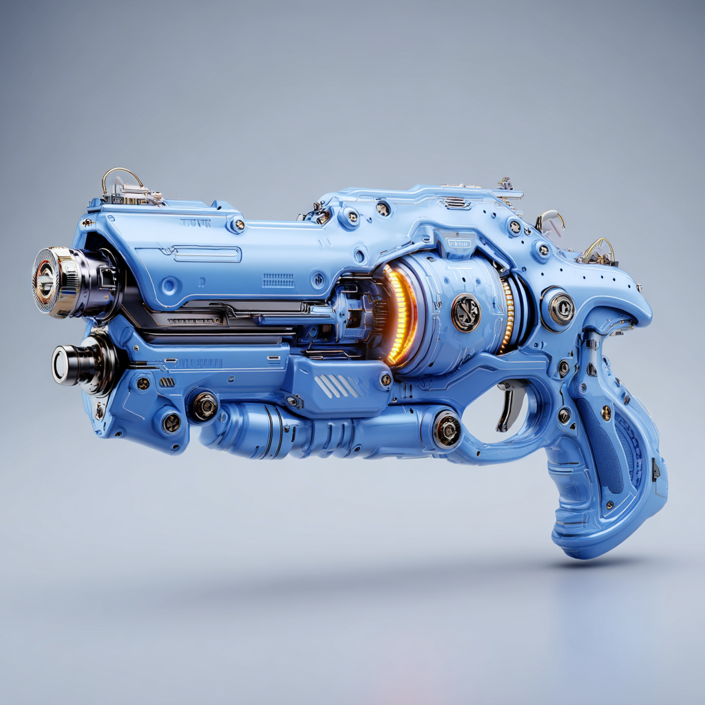 赛博朋克生物力学霓虹蓝色侧臂武器的完整图像,超详细和逼真。颜色鲜艳的碳组件,脉冲能量喷射器,闪亮,发光的界面节点,。光滑的曲线混合了尖锐的工程元素。逼真的概念设计,32k细节,光滑的工业表面。作为工作室产品拍摄,在干净的空白背景上渲染,柔和均匀的照明,没有阴影,没有环境,居中构图,高端概念艺术插图。