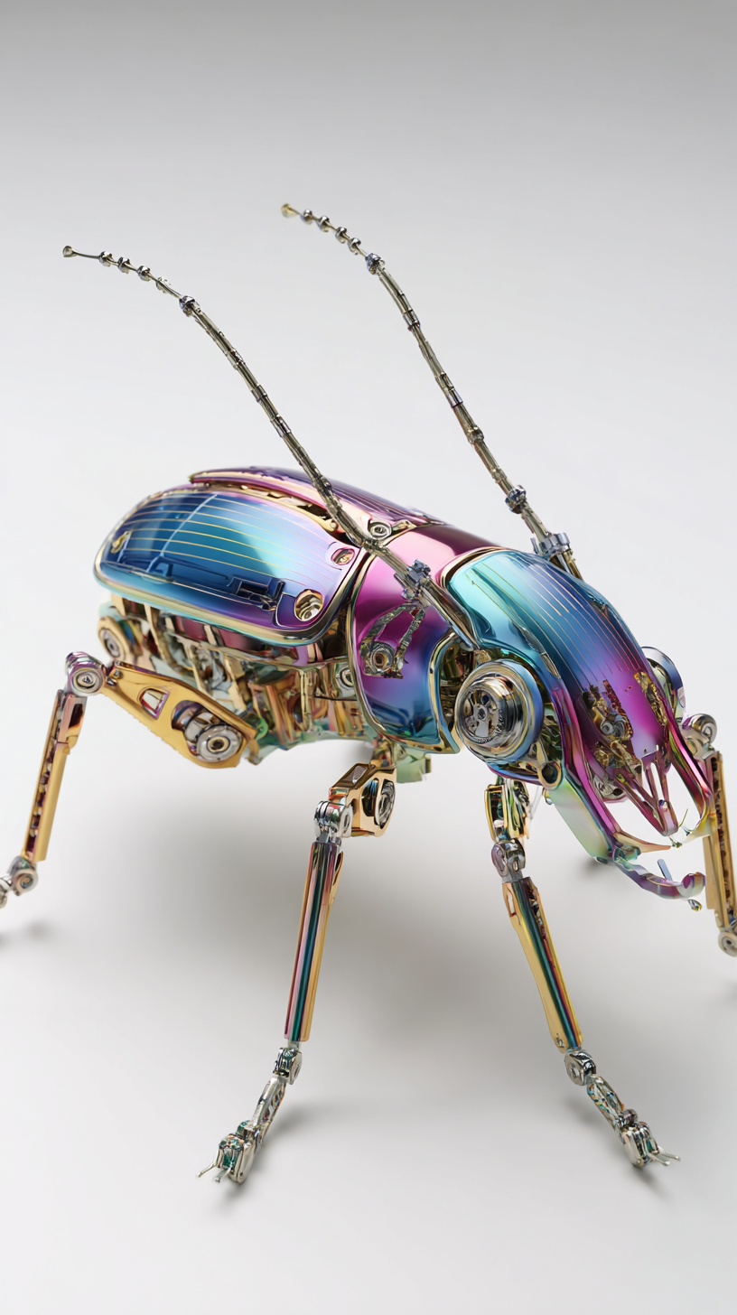 超细节的机器人雄鹿甲虫,工程设计灵感来自温柔的怪物美学,拉丝镀铬外骨骼与全息彩虹高光,光滑的最小机械关节,锋利的抛光下颌骨,微妙的内部发光,优质的未来主义细节。在纯白色无缝背景上拍摄,高对比度的工作室照明,清晰的产品摄影风格,宏观水平的清晰度,阴影柔和而最小,浮动博物馆规格的呈现。85mm产品镜头,超干净反光,现代奢华科技美学。