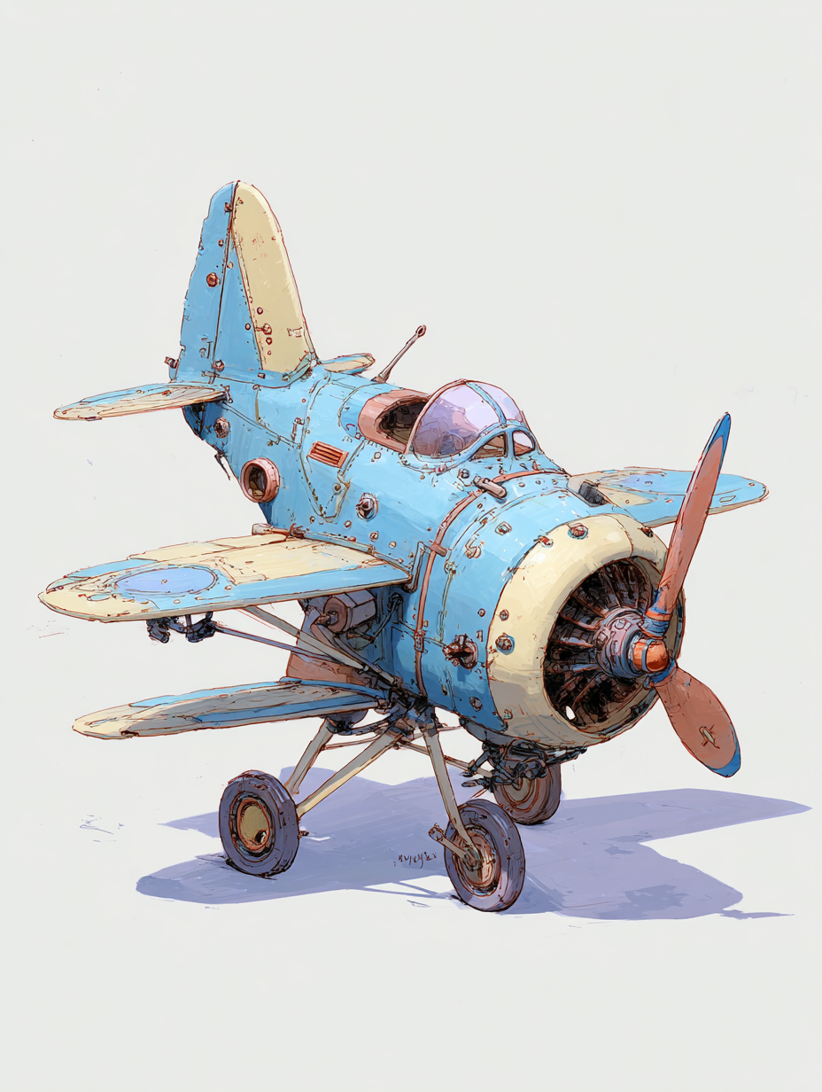 一个异想天开的卡通插图在一个柔软的,水彩风格的老式螺旋桨飞机。这架飞机被漆成浅蓝色和奶油色,在机翼和机身上有装饰铆钉。这架飞机有一个圆形的前锥体,一个带有旋转螺旋桨叶片的单螺旋桨,以及一个带有弯曲挡风玻璃的驾驶舱。机翼定位在一个小角度,和尾部部分有一个独特的设计与米色面板。这幅插图线条简洁,有一种温柔的托儿所般的美感。这架飞机的侧面轮廓图以纯白色为背景。整体构图有一个温柔的,复古的感觉与柔和的边缘和柔和的颜色。