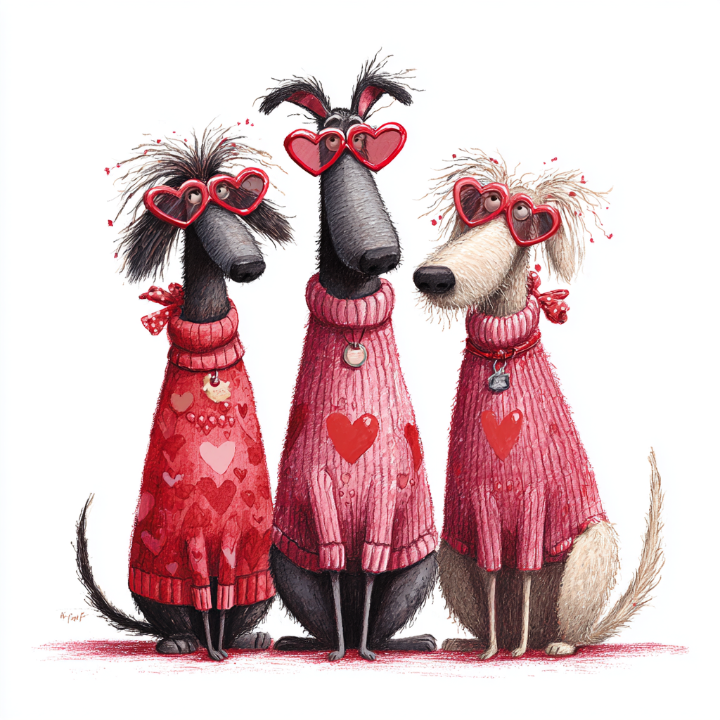 三只可爱的狗并排站着,全身。每只狗狗都穿着舒适的红色和粉色针织毛衣,心形图案,情人节主题。心形太阳镜,可爱的蝴蝶结和发带,卡哇伊美学。插画采用曼迪·迪舍(Mandy Disher)奇思妙想的手绘风格,鲜艳的色彩,细节质感的服装(针织毛衣),暖色调的水彩效果,表情丰富的脸配上心形眼镜,喜庆的情人节气氛,白色背景,高度细致,数码插画,童书风格