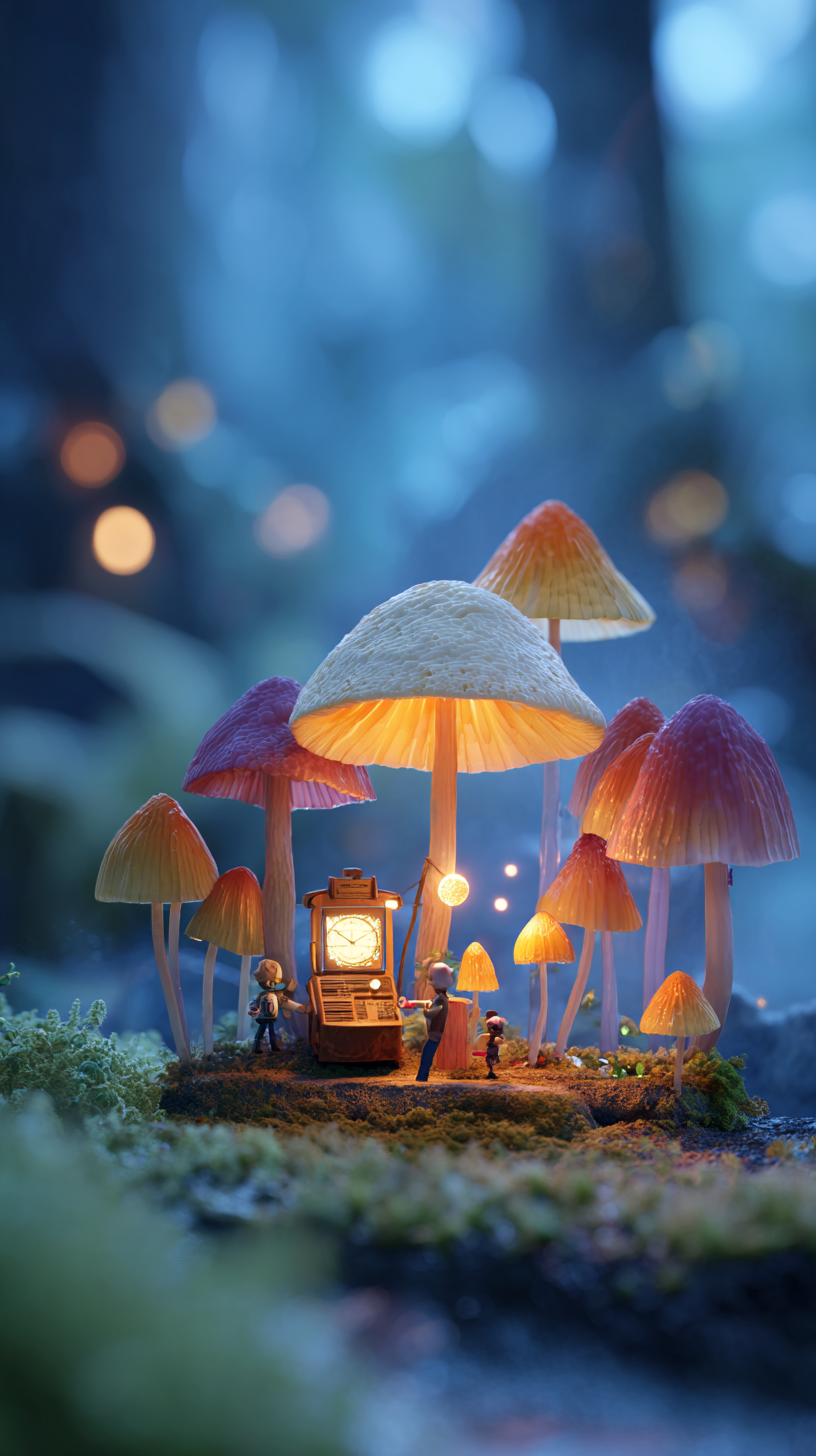 头顶上的无人机视图,微型幻想的客人在一个神奇的森林里,围绕着一个发光的蘑菇形状的桌子举起酒杯,周围是生物发光的苔藓和萤火虫,梦幻般的柔和的雾,一块放置在蘑菇旁边的复古手表,电影般的灯光,高度细节的8K渲染,宏观粘土微型风格