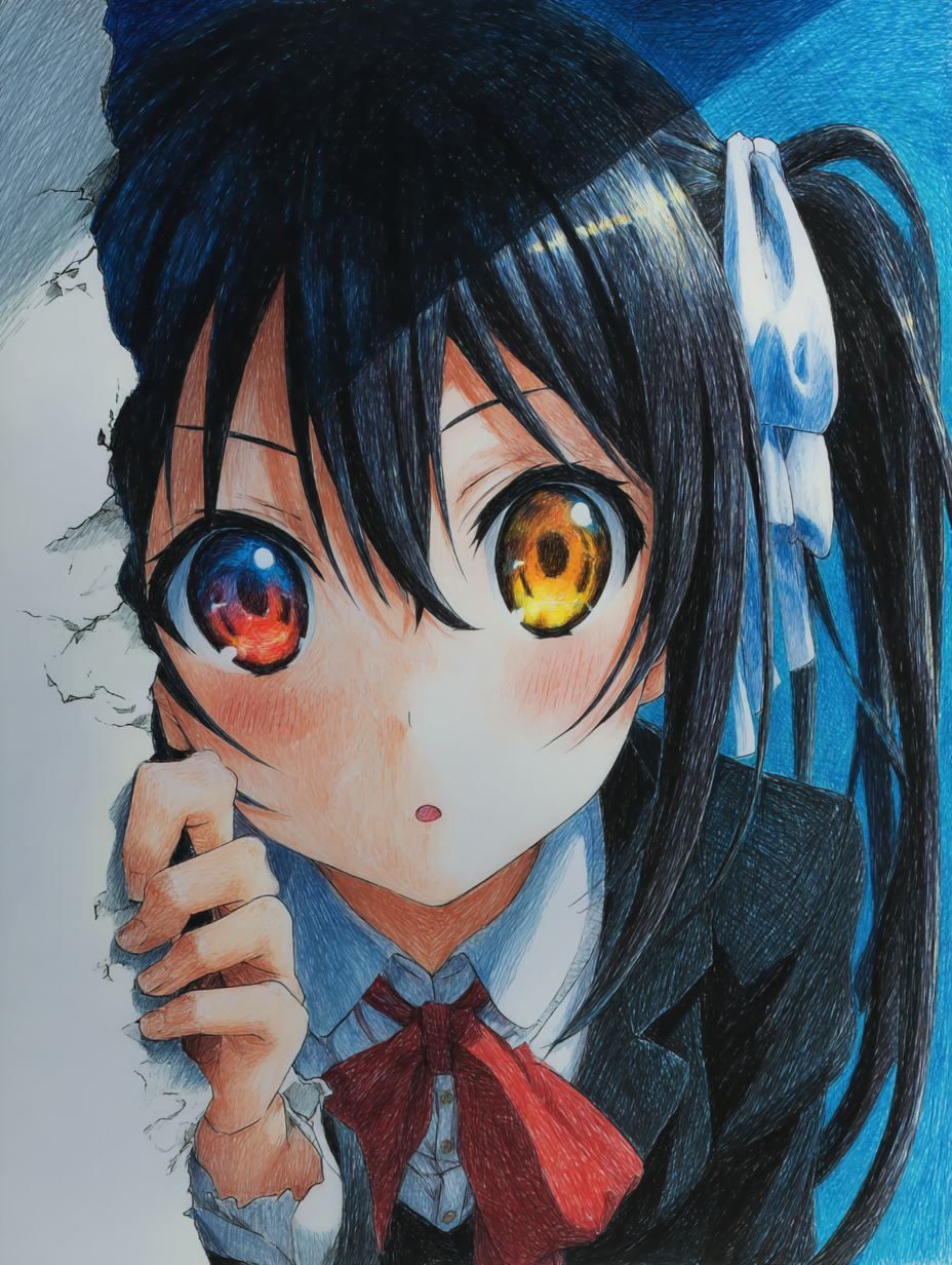 来自date A Live的Kurumi Tokisaki。她的眼睛透过两根手指盯着镜头,从破边的蓝纸边缘向外窥视。黑色的头发,双马尾,不同颜色的瞳孔,红色和黄色的瞳孔,黑色和红色的女仆服装,黑色和红色的女仆头饰,细节的脸,肖像,她的眼睛的特写,明亮的颜色,阳光落在一只眼睛,背景是一个坚实的明亮的蓝色,创造了一个鲜明的对比,强调了她的脸和腿的高度细节。她的黄色和红色的眼睛有柔和的发光效果,增加了场景的深度。这种插图风格将焦点集中在主题上,同时保持简单和优雅,使其适合各种应用,如角色设计或动画。肩部以上的彩色铅笔画,这幅作品的灵感来自坂本新一的漫画风格。强调干净的线条来捕捉插图中的运动和深度。使用大胆的阴影来对比明暗区域。追求高分辨率和超逼真的外观。