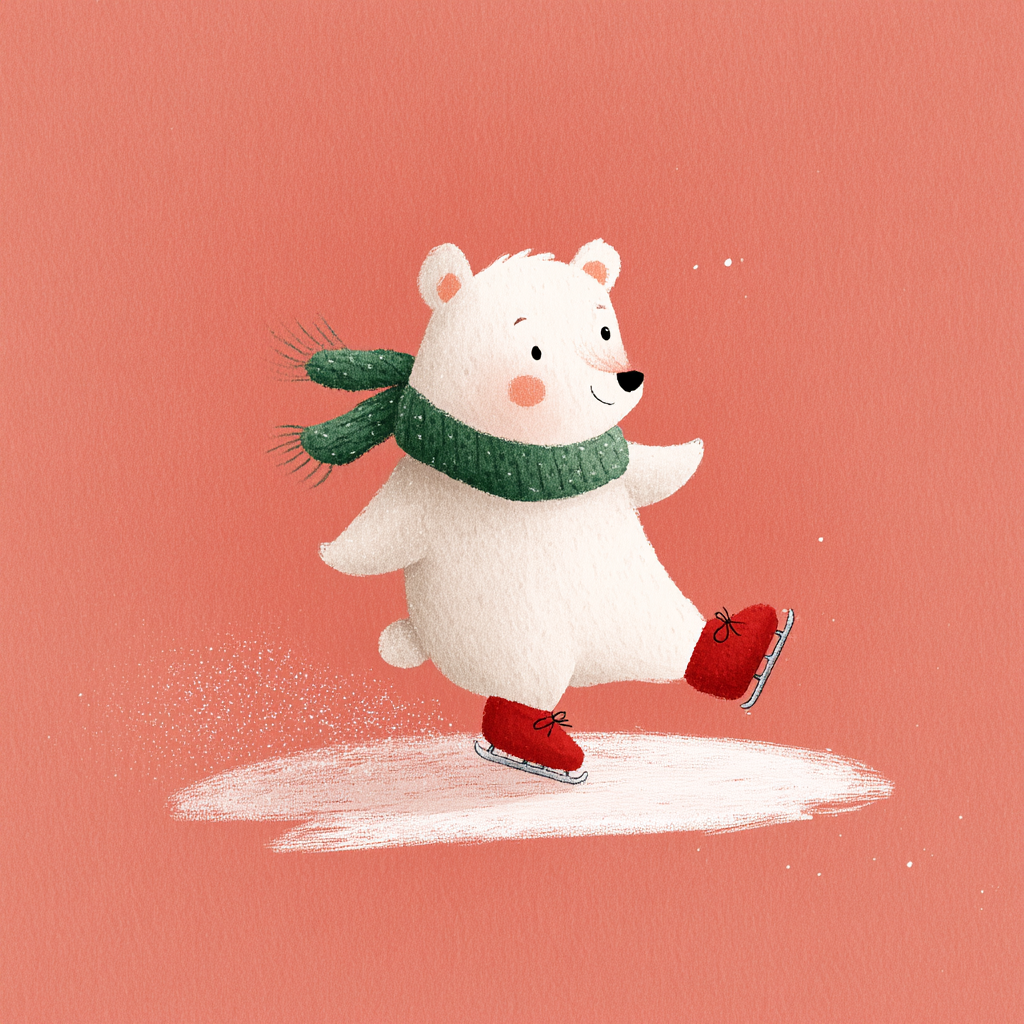 极简主义的水彩和水粉插图,一个可爱可爱的白熊滑冰与红色的溜冰鞋和绿色小点羊毛围巾,在温柔柔和的腮红色调,柔和和漫射的光,温暖和自然的感觉,丰富的颜料,最小的细节,干净的边缘,复古迪斯尼故事书水彩风格,托儿所艺术,孤立在一个干净的白色背景,没有纸的纹理,没有阴影,高分辨率,完美的升级