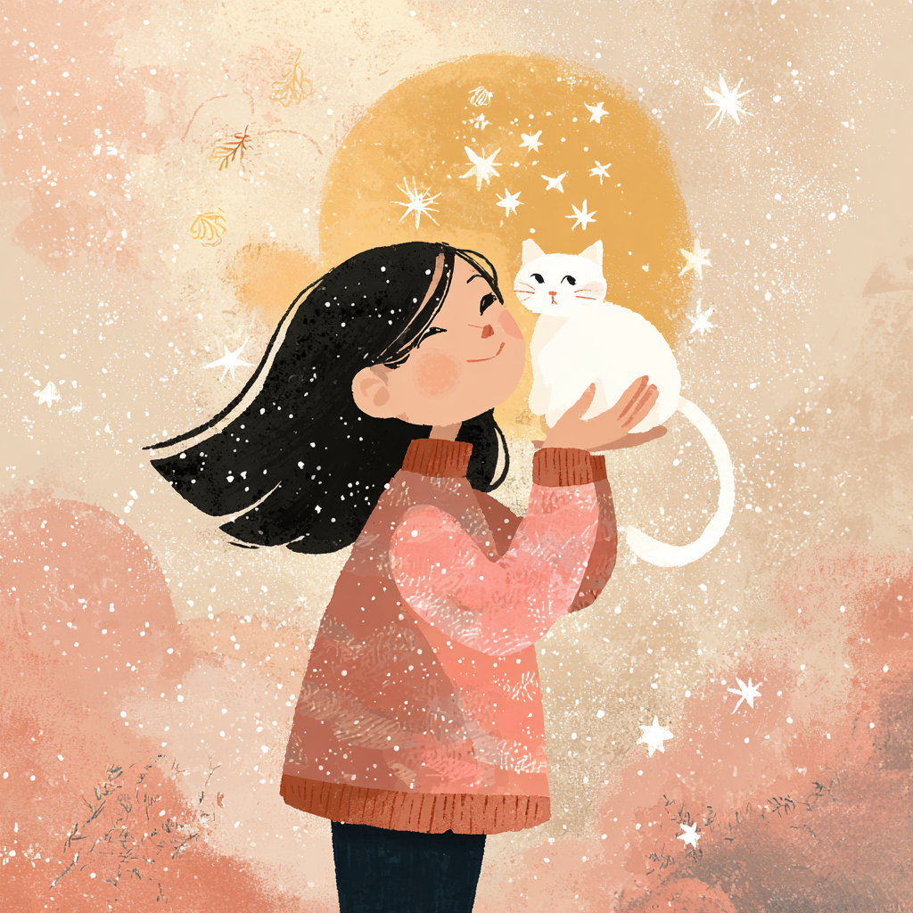 冬天,女孩怀里抱着一只猫,它坐在她的手上,从她的肩膀后面向外看,柔和的粉彩插图,被天上的星星和月亮包围着。这件艺术品有一种有趣的感觉,让人想起中世纪的儿童书籍插图。它使用温和的颜色渐变和特点干净的线条没有任何纹理或阴影的整体欢快的气氛,复古风格。