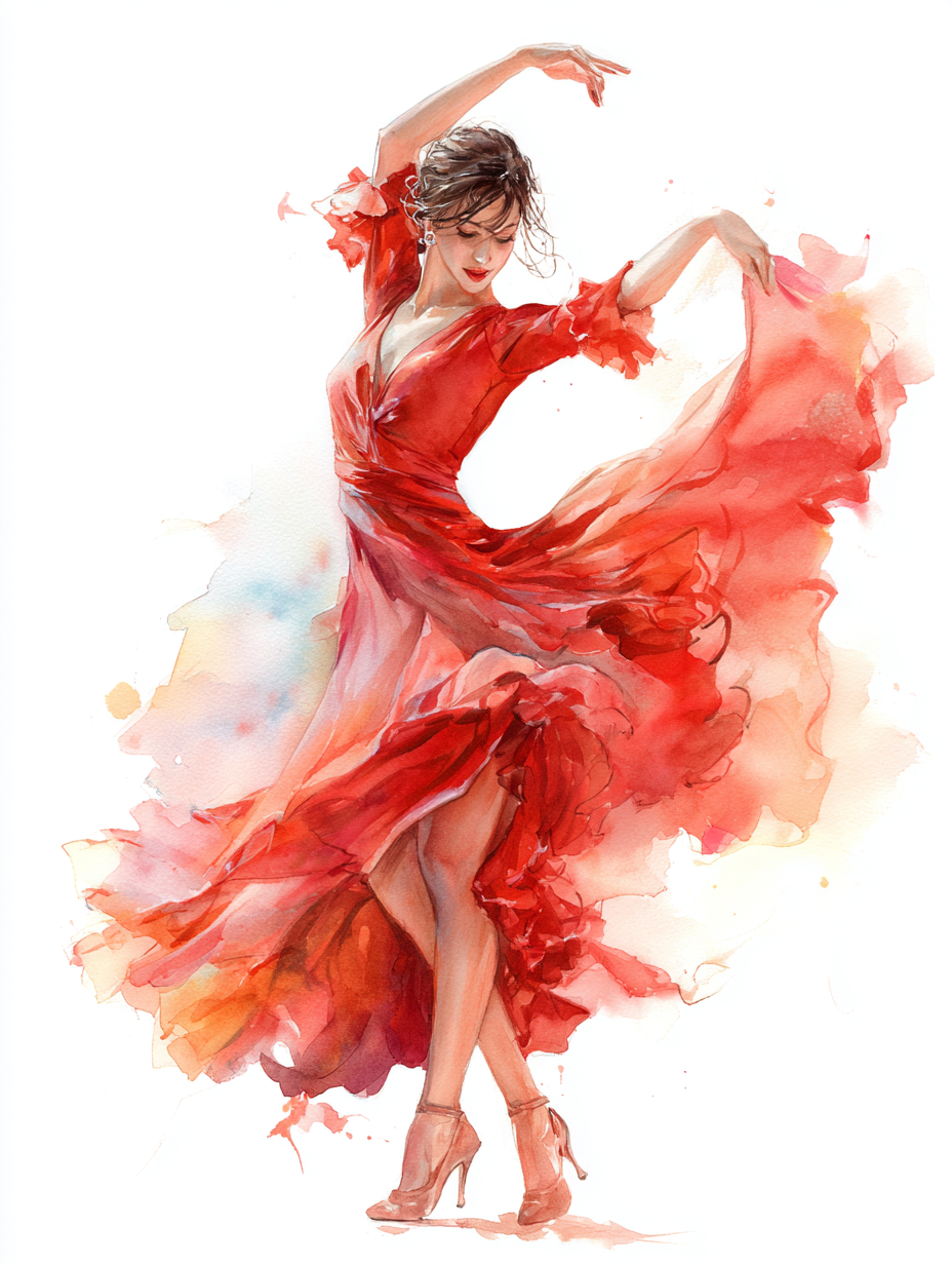 水彩绘画。一位非常美丽的年轻女子穿着飘逸的红色连衣裙跳着弗拉门戈舞,动作富有表现力,姿势优雅,姿势充满激情和优雅。柔和的水彩画风格,细腻的笔触,柔和的色彩过渡,轻盈的质感,通风梦幻的氛围,艺术的插图,精美的艺术,柔和的色调,高细节,情感和浪漫的心情