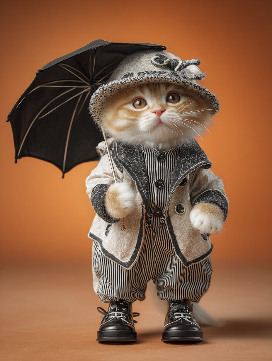 一只雨天的巴黎绣花猫,穿着时髦的风衣,条纹打底裤,小靴子,拿着一把黑色雨伞。中性的奶油色和沙色调色板,缝制的人造刺绣纹理,被毛和胡须的柔和风动,柔和的腮红,极简的精品美学,高细节,可供印刷
