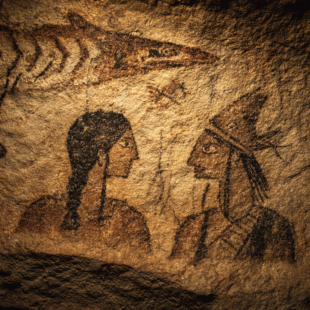在西班牙北部的阿尔塔米拉洞穴中发现的风格的洞穴绘画,描绘了一个马尾辫的女孩(我在图片上提供)和她的魔鬼,包括我在图片上提供的动物。图像应该有轻微的颗粒,好像是由世纪中叶的哈苏相机拍摄的。不要在样式参考上改变每个人的布局。不要说话。这个女孩是一个希腊女孩。