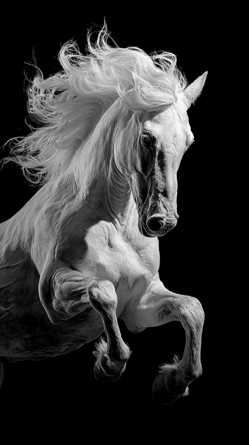 一个非常详细的,逼真的白马在跳跃中,从侧面捕捉到所有的蹄离地。马肌肉发达的身体和光滑的皮毛应该被突出,以逼真的精度展示每一缕皮毛。它的鬃毛和尾巴在风中戏剧性地摆动,强调运动。马的眼睛应该锐利而强烈,反映出力量和专注。灯光应该强调马毛的逼真质感和它的动态跳跃。展示了整个马的侧面半空轮廓,与黑色背景形成鲜明对比。