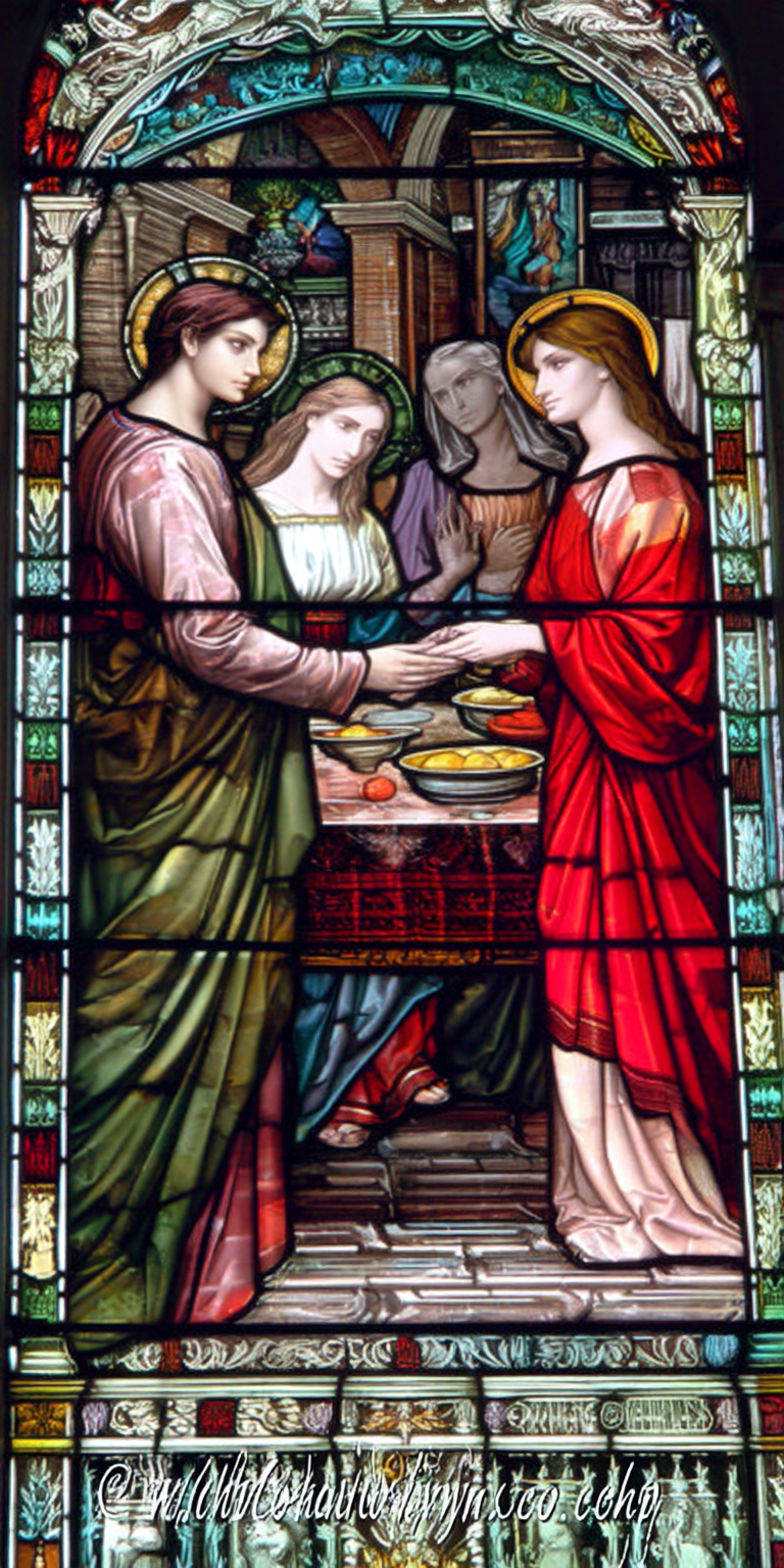 一个逼真的彩色玻璃窗,描绘了一个男人和一个女人站在对面,在桌子上伸出手。在中间,另一个女人主持和解,亲切地微笑着表示赞同。错综复杂的引线,发光的宝石色调,神圣的背光,大教堂的氛围。超细节,逼真的玻璃纹理,光线穿过灰尘。以华丽的彩色玻璃窗的风格。