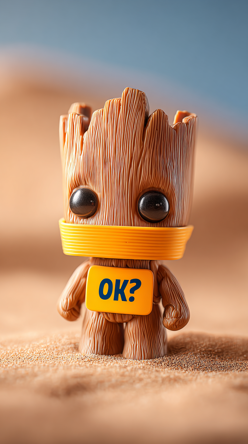 极简主义,马作为Funko Pop的乙烯基人物,厚实的皮毛,用黄色胶带覆盖嘴巴,胶带只适用于嘴唇区域,嘴巴密封,其他地方没有胶带,胶带上有文字“OK?”。干净的固体柔和的沙漠沙子背景,极简主义,工作室照明,一致的调色板,相同的照明设置 。MJ中文版的绘画效果: