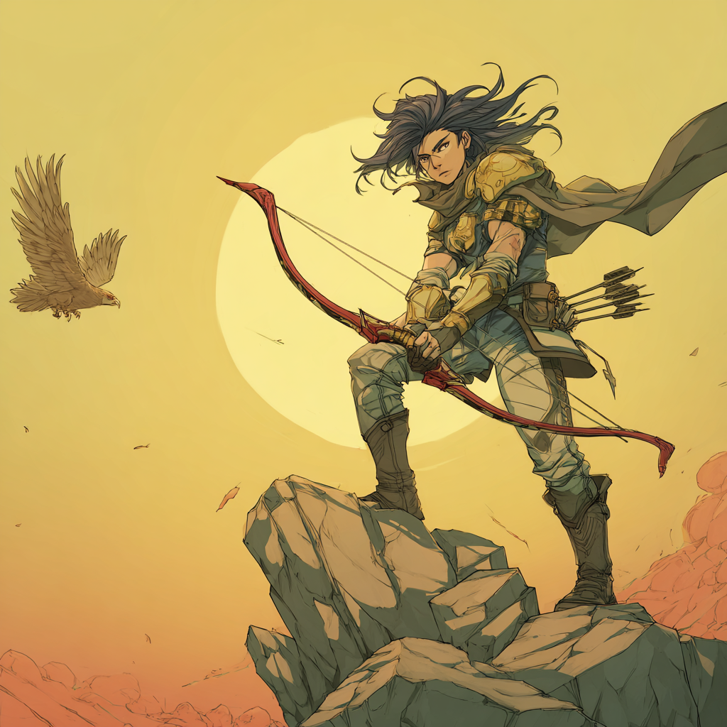 大羿站在高山之巅,身披青铜色轻甲(单侧肩膀覆盖肩甲)金色长发飞舞,暗金色眼眸透露出坚韧不拔的意志,肌肉线条炸裂的手持一张赤红刻有金乌盘旋纹路大弓,做拉弓式,对向天空的金乌烈日(画面中的烈日不能与人物重合,要有烈日当空,人物在烈日脚下的即视感)。要求画风参照动漫fate人物形象,画面不能有任何的崩坏。