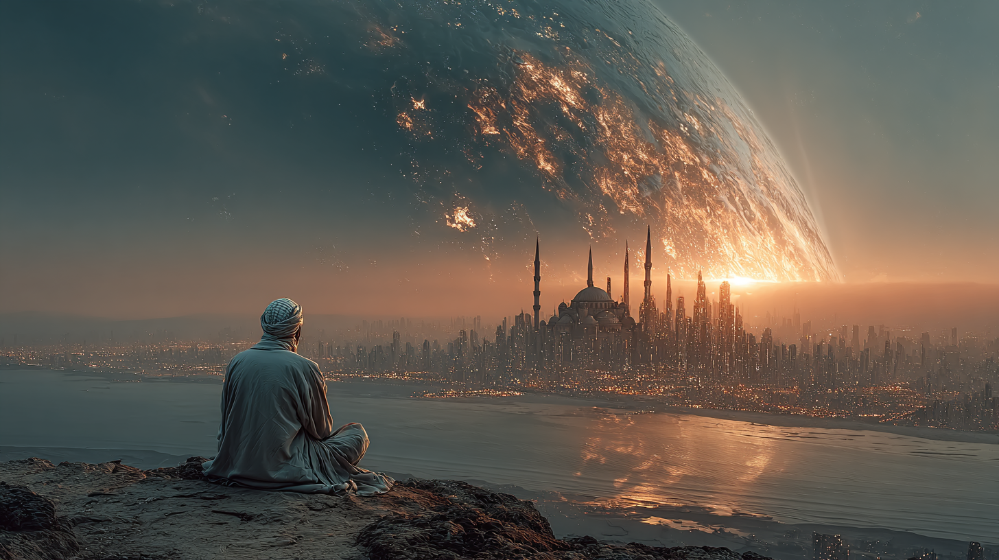 一位身着传统白色长袍、头戴白色圆帽的异乡人,盘腿静坐于崎岖山丘之上,背对观者,凝望远方山顶那座灯火辉煌的清真寺。山下是如星河般璀璨的赛博朋克风城市,天空中挂着一颗星球,云海翻涌成迷幻的虹彩渐变,无数繁星点缀其间。整体画面融合超现实主义,故障艺术风格,电影镜头,营造出神秘而史诗的梦幻氛围。