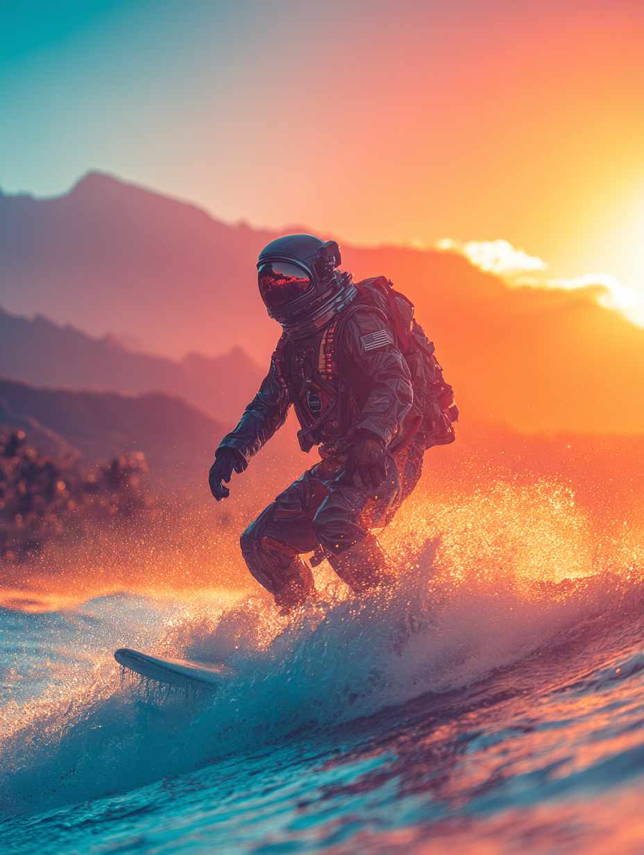 超现实主义的照片,一名宇航员穿着亚光黑色太空服,带着发光的红色,在夏威夷的日落时分冲浪,金色和橙色的天空,火山山脉作为背景,电影般的戏剧性灯光,超详细的体育摄影