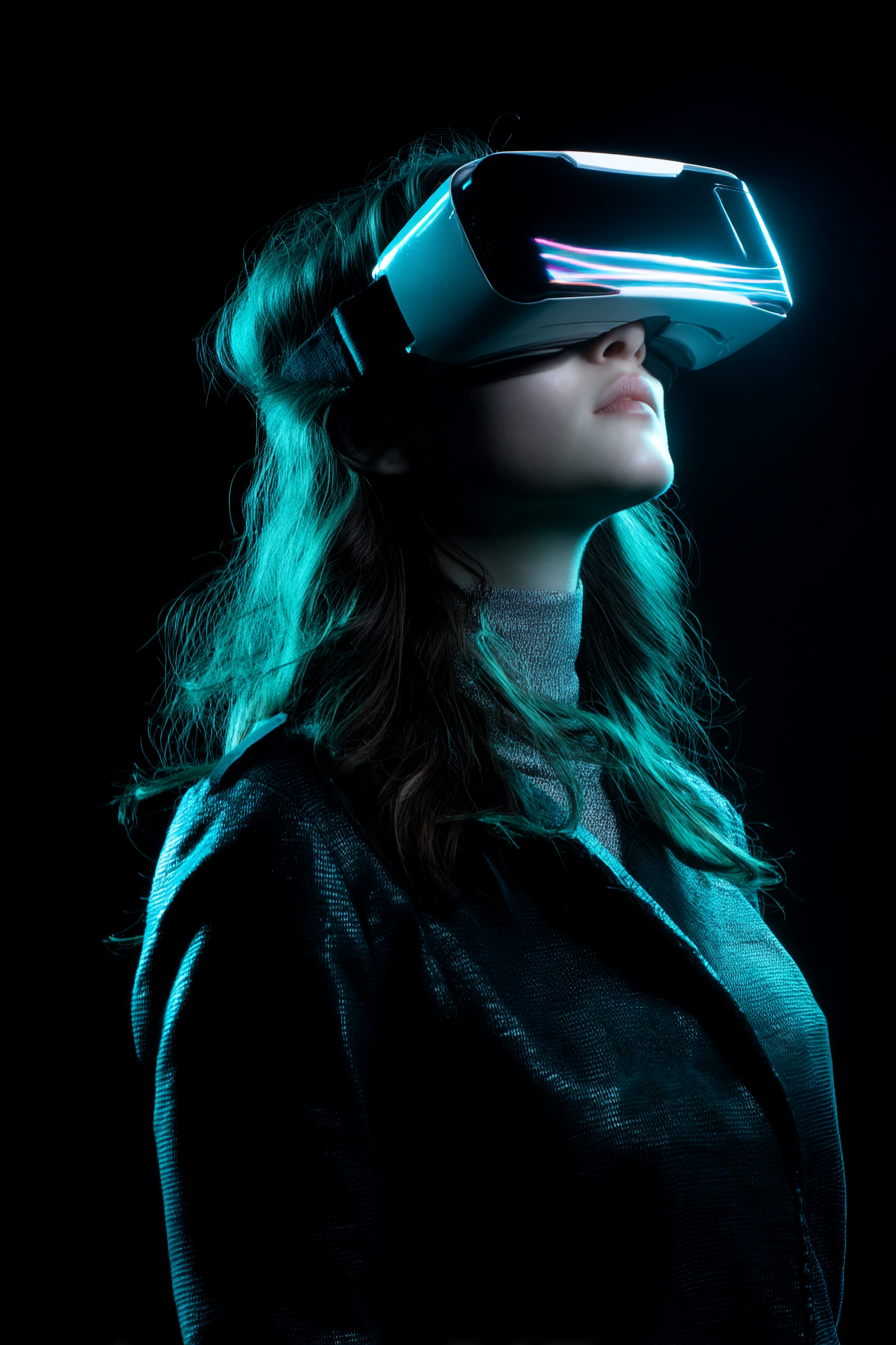 现实的3D插图,一个年轻的女人在未来的VR耳机,孤立的数字。整个场景被#3549E4的深霓虹色调照亮,在她的头发和夹克上有发光的反射。极简构图,黑色背景(#18171B),立体3D照明。这款耳机有时尚的未来主义设计,带有发光的蓝紫色条纹(#3549E4)。图向上,象征着创新和与人工智能的联系。现代企业和高科技美学。