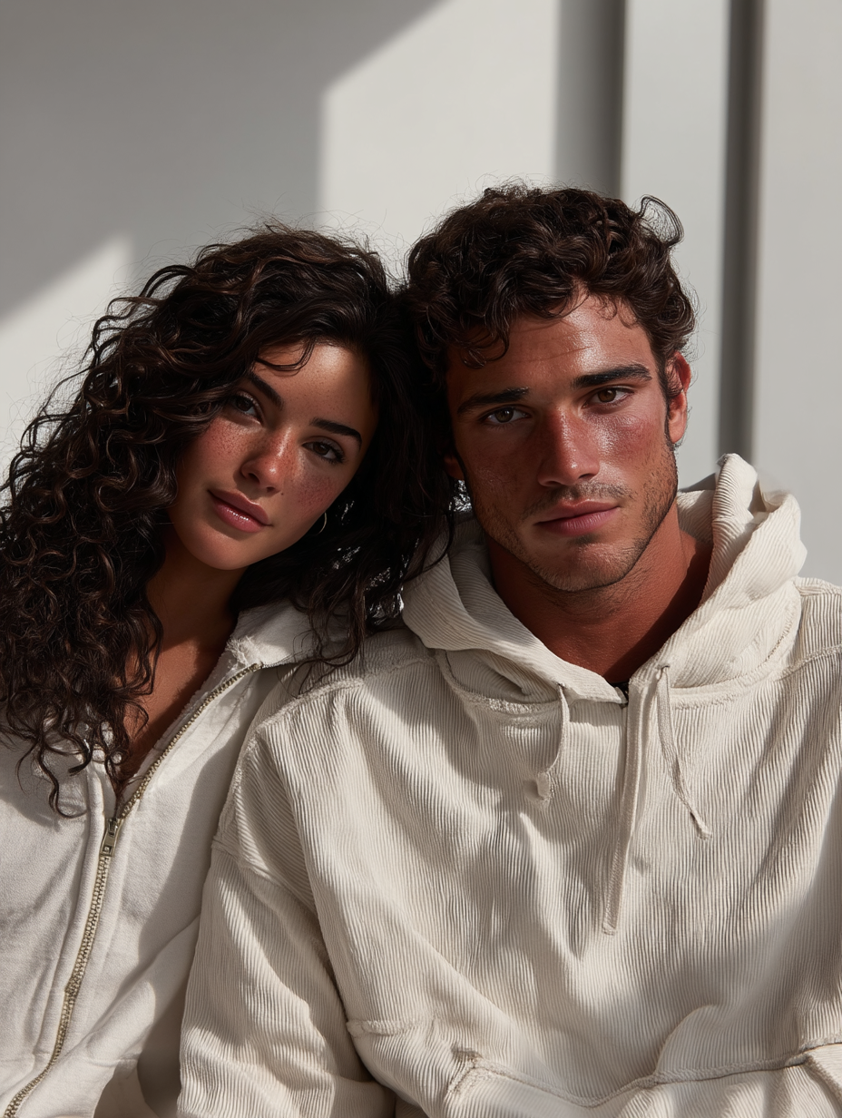 这是一个电影式的,超现实主义的中景镜头,一对看起来很真实的夫妇在白天紧密地坐在机场门口。在柔和,凉爽的自然日光流通过大玻璃窗捕捉,蓝色的亮点和自然阴影创造了平静,现代的旅行心情。这位女士有着黑色的卷发和真实的人类面部细节,可见细腻的皮肤纹理,逼真的毛孔,微妙的不均匀色调,微弱的雀斑,微小的瑕疵,以及逼真的灯光反射。她的眼睛透出自然的湿润和深邃,她的表情温柔、温暖、真诚。她穿着一件米色的厚连帽衫,搭配米色的运动裤和干净的白色运动鞋。她轻轻地靠在男人的肩膀上,手搭在他的手臂上,微笑着,流露出真正的情感和联系。他的头发短而整齐(不戴无边帽),五官逼真,毛孔自然,皮肤纹理,轻微的胡茬,细微的皱纹,轻微的不对称,逼真的眼睛反射。他穿着一件黑色厚连帽衫,搭配黑色运动裤和白色运动鞋。他的手臂随意地搭在她的肩膀上,他的姿势放松而自然,分享着真正的夫妻时刻。两人腰部以上都被框起来,坐在光滑的黑色机场椅上,他们的肢体语言显示出舒适和亲密。在他们身后,大玻璃窗显示飞机和明亮的阴天,渲染真实的反射,深度和现实的光扩散。相机:50mm镜头,中镜头(腰部以上),略低眼平角。灯光:漫射自然光,冷中性色调,柔和逼真的对比。心情:平静、亲密、电影、浪漫、现代旅行美学。风格:逼真的电影摄影,超高保真的人体真实感,逼真的皮肤纹理,自然的不对称,逼真的灯光物理,真实的情感连接,8K分辨率质量,HDR色彩深度。