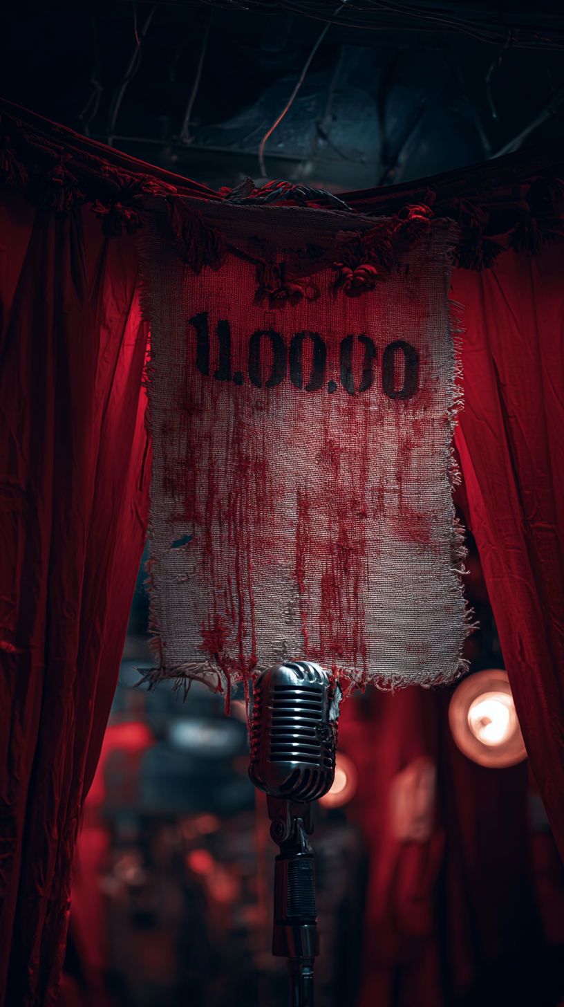这是一个电影镜头,一个老式的麦克风挂在天花板上,前面是深红色和脏白色的天鹅绒衬窗帘,织物上写着令人不安的黑色血迹,大尺寸的文字“10:00:00”,有点撕裂,由一个戏剧性的聚光灯照亮,在窗帘上产生圆形的光芒,周围是完全的黑暗,唤起一种怪异和戏剧的气氛,拍摄于夜晚,在灯光昏暗的剧院里,用佳能EOS R5, 85mm f/1.2镜头拍摄。高对比度的深黑色和深红色调