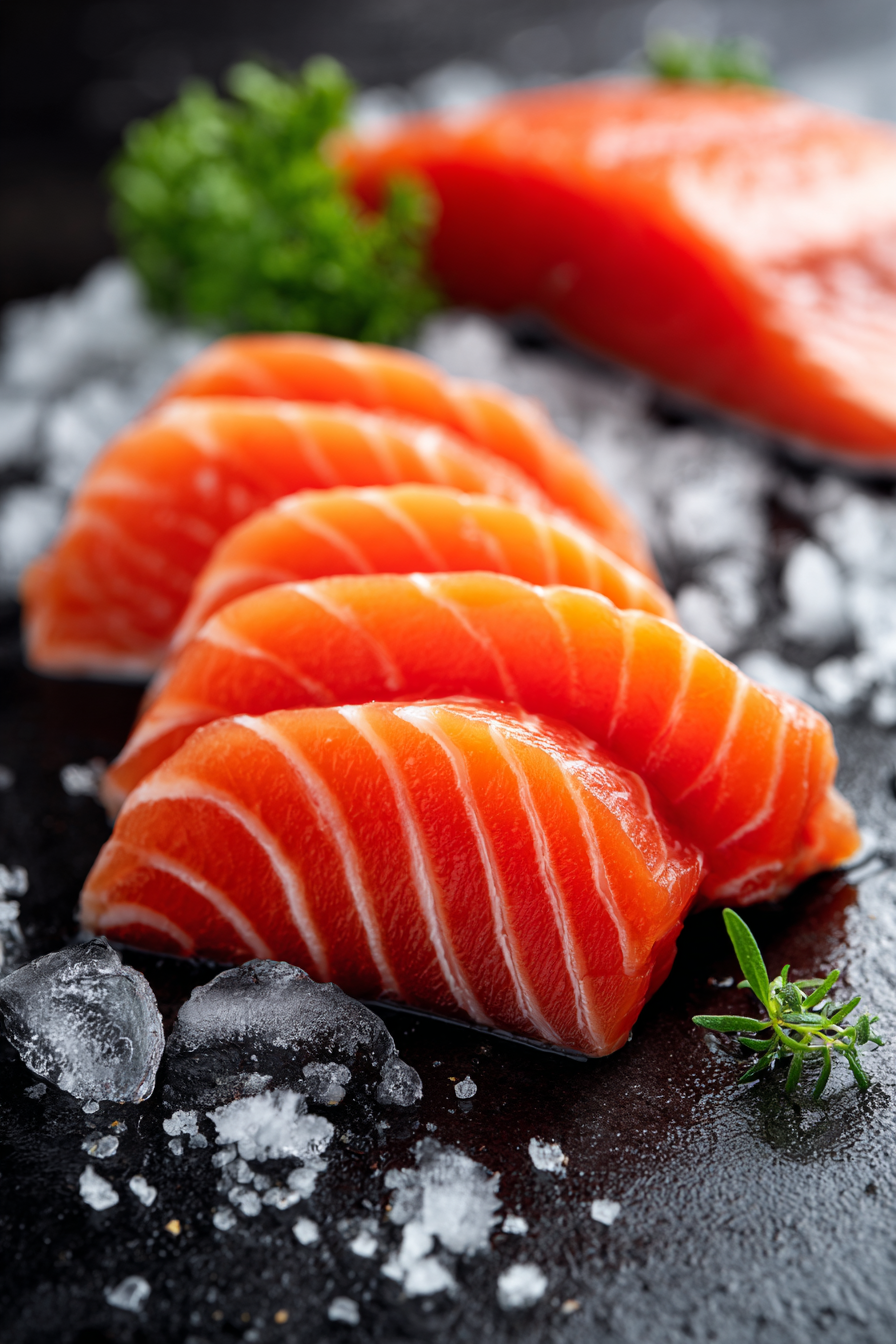 一张东港黑金枪鱼的高清海报展示了精致的生鱼片整齐地放在冰上,配上一点芥末。在背景中,一条金枪鱼从海洋中跃出。该设计包括一个黑金枪鱼作为一个国际品牌,代表了台湾东港的海洋遗产。整体风格高端,用写实手法捕捉鲜鱼片的细腻质感。构图对称平衡,营造出优雅的氛围;